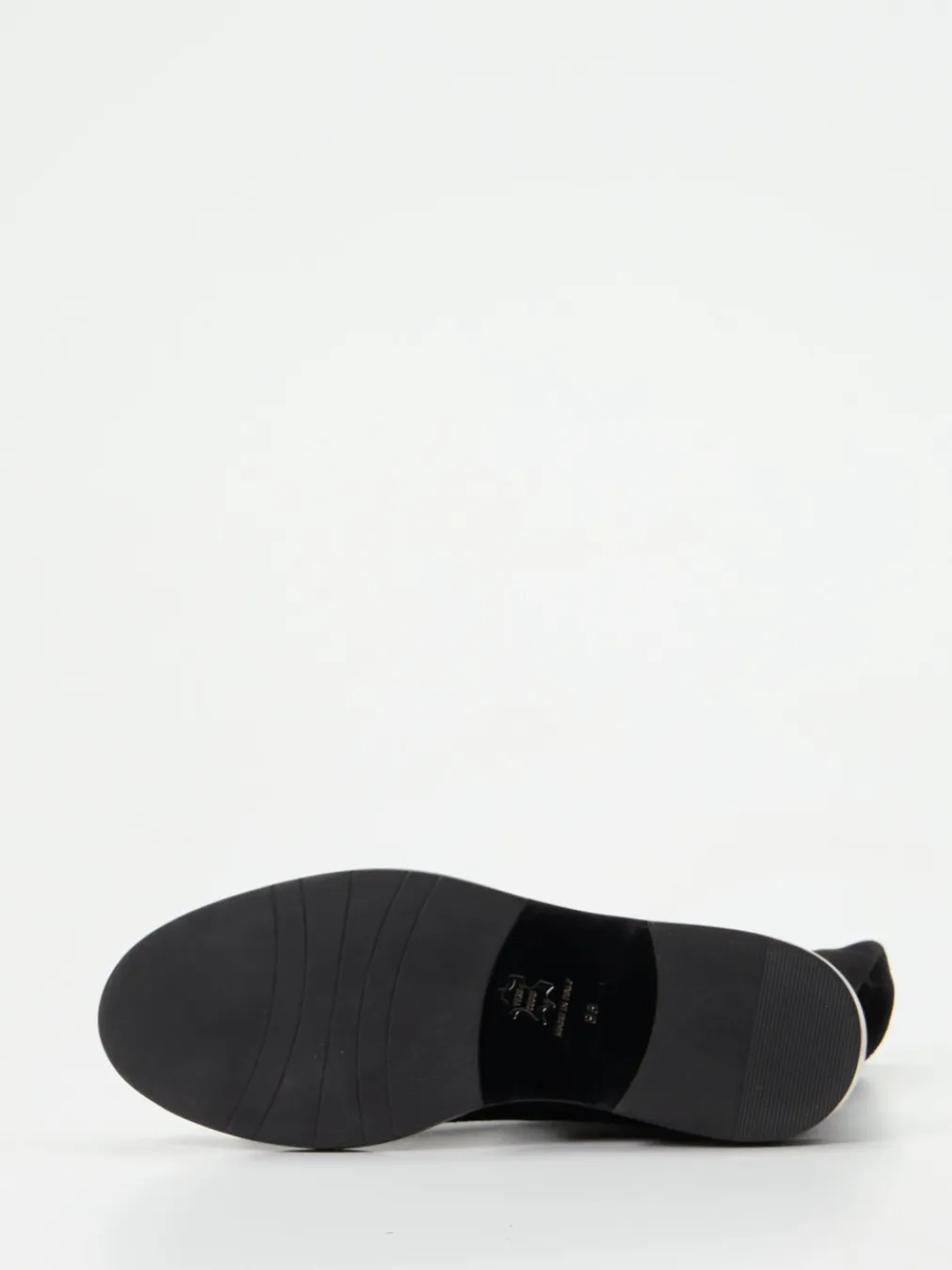 Eleganz bis zum Knie.Konstantin Starke präsentiert einen femininen Overknee-Stiefel aus edlem schwarzen Veloursleder. Für stilbewusste Tage im Büro oder elegante Freizeit-Looks bietet dieser Stiefel mit flacher Laufhöhe und schlanker Silhouette angenehme Alltagstauglichkeit. Das samtig angeschliffene Veloursleder, kombiniert mit tonalen Steppnähten und einem verdeckt verlaufenden Reißverschluss auf der Rückseite, unterstreicht das minimalistische Design. Der Blockabsatz sorgt für Stabilität, während der schräg abschließende Schaft modische Raffinesse beweist. Im Trend von Quiet Luxury positioniert sich dieses Modell als zurückhaltendes Statement-Piece. Perfekt zu Oversized-Mänteln und monochromen Looks – ein Klassiker mit Haltung und Komfort.
