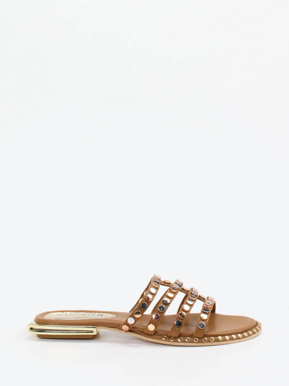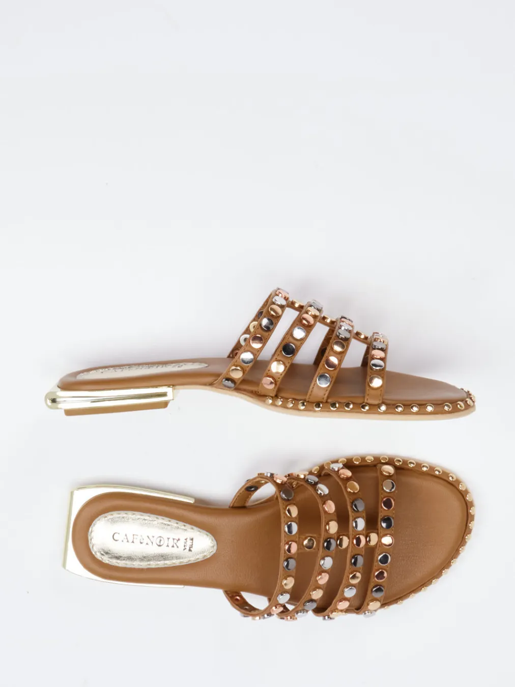 Slide-Sandale im Metallic-Upgrade.CAFèNOIR bringt mit dieser Pantolette ein expressives Highlight ins Damen-Sortiment. Für sommerliche Events bietet das cognacbraune Kalbleder mit glänzender Oberfläche und multicolorigen Metallic-Nieten einen auffallend glamourösen Look. Die flache, offene Silhouette mit feinen Riemchen und goldfarbenem Absatzrahmen harmoniert mit dem weich gepolsterten, lederbezogenen Fußbett. Die hochwertige Kunststoffsohle und die detailverliebte Nietenanordnung unterstreichen modernes Design mit Glam-Faktor. Ideal zu Strandkleidern oder City-Outfits. CAFèNOIR kombiniert markentypische Extravaganz mit alltagstauglichem Komfort.