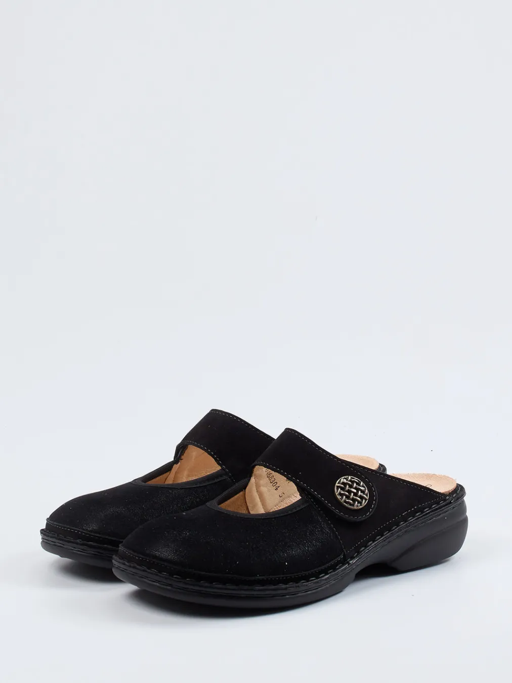 Komfort trifft auf klare Form.Finn Comfort präsentiert eine ergonomisch konzipierte Damen-Pantolette für entspanntes Tragen zu Hause oder im Alltag. Das schwarze Nubukleder ist samtig angeschliffen und bildet zusammen mit dehnbarem Stretchmaterial eine anpassungsfähige Oberfläche. Der praktische Klettverschluss mit dekorativer Metallagraffe ermöglicht eine individuelle Weitenregulierung. Innen sorgt ein lederbezogenes Korkfußbett für gesundes Gehen – bei Bedarf austauschbar gegen eigene Einlagen. Die profilierte PU-Sohle mit Schock-Absorber dämpft optimal. Ideal für alle, die Komfort mit unaufdringlichem Stil kombinieren möchten. Made in Germany – ergonomisch gedacht, hochwertig gefertigt.