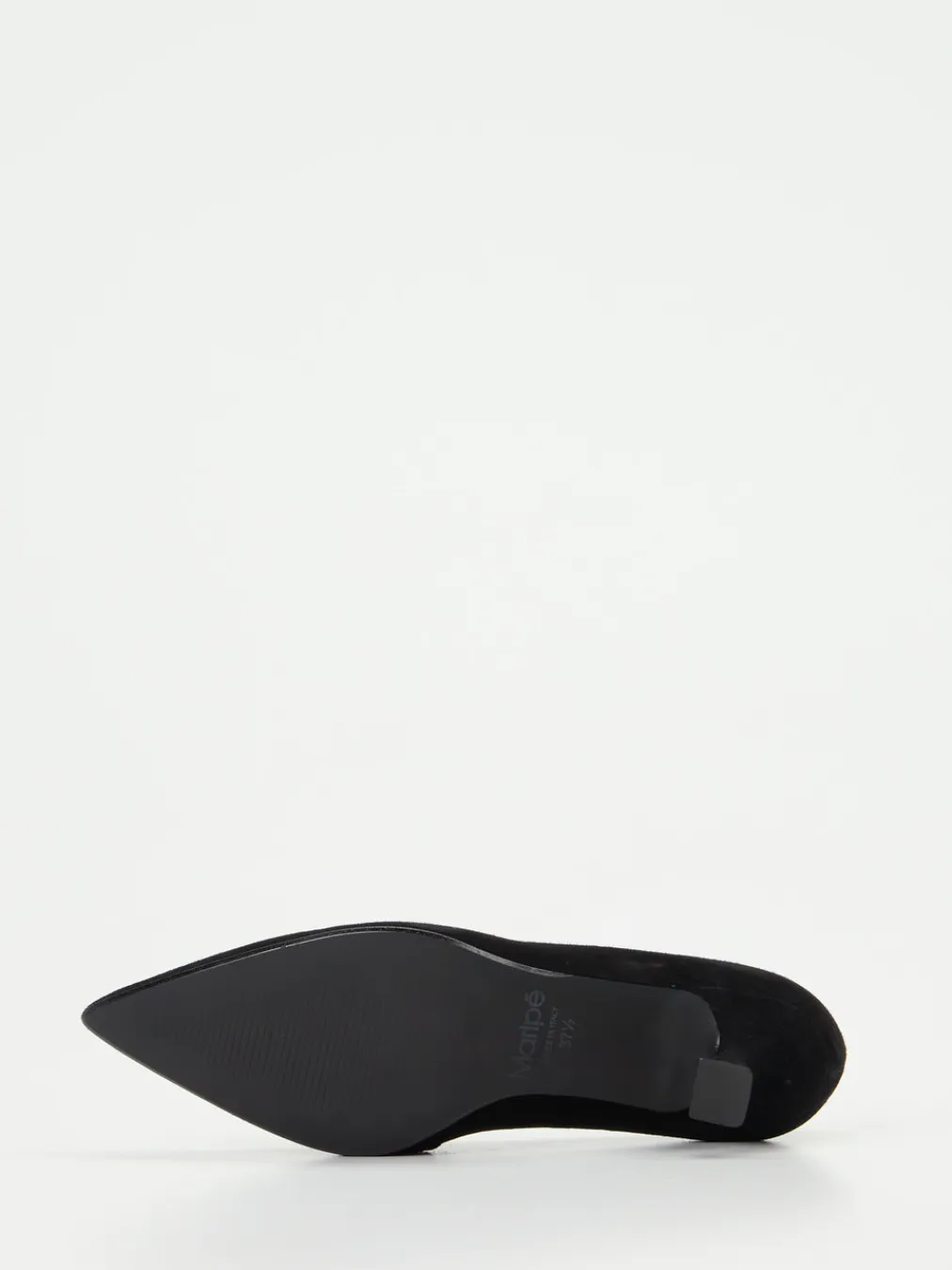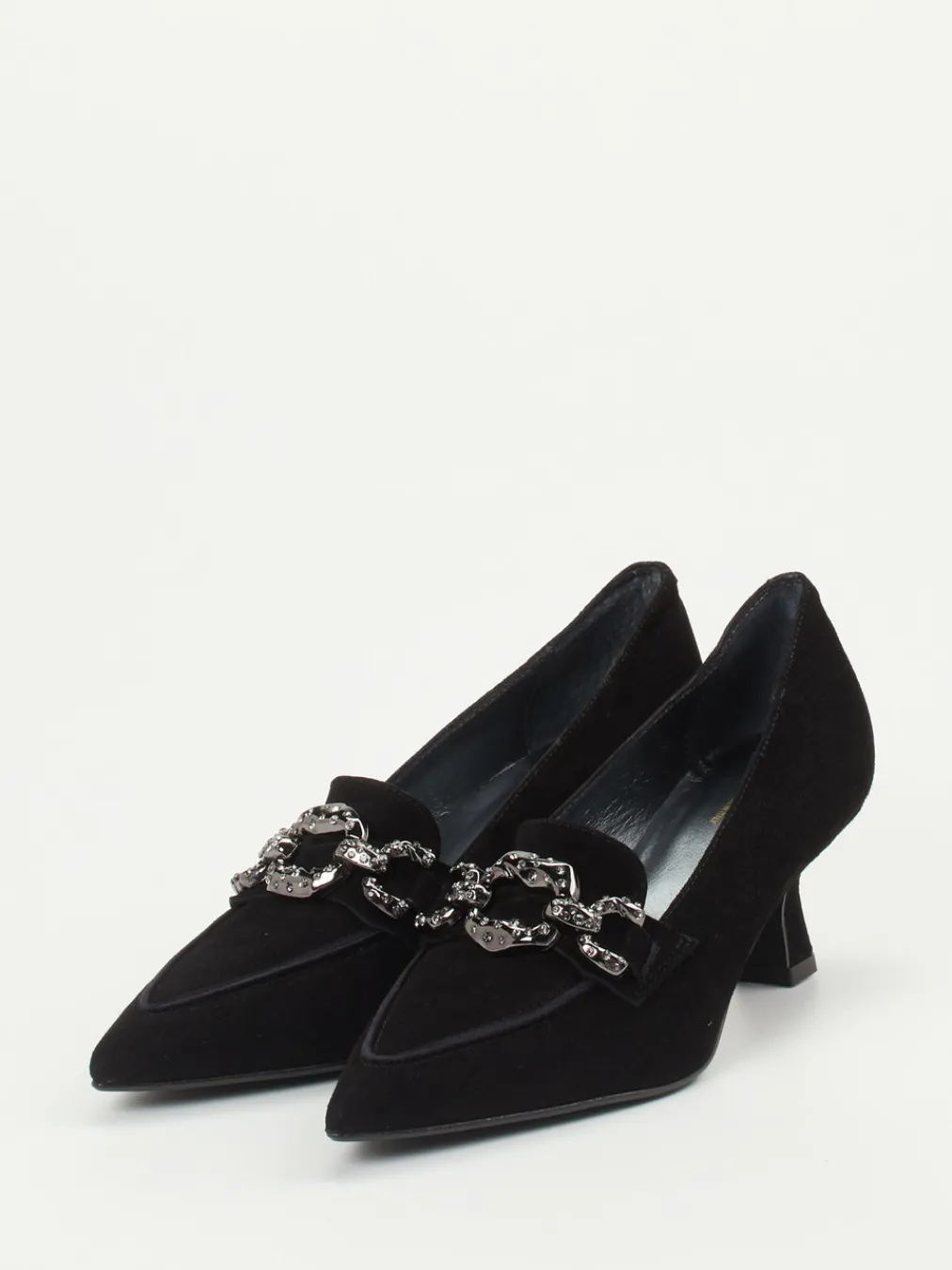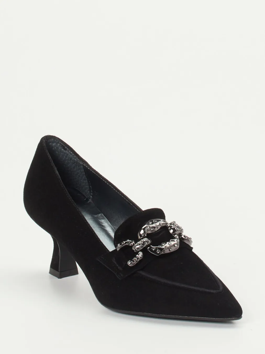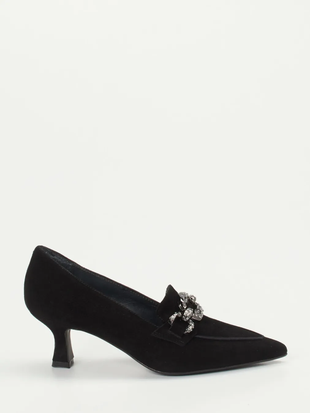 Schwarzer Chic neu interpretiert.Maripé präsentiert mit diesem Pump ein stilvolles Modell für Damen, das klassische Eleganz mit modernen Akzenten verbindet. Für Auftritte im Büro oder auf Events bietet der Pumps aus samtig-mattem Veloursleder eine perfekte Mischung aus Komfort und Stil. Sein spitz zulaufendes Design und das offene Fußdekolleté verleihen ihm femininen Ausdruck, während die silberfarbene Gliederkette mit Strassbesatz einen auffälligen Kontrast zur tiefschwarzen Oberfläche setzt. Der 5 cm hohe Kitten Heel sorgt für angenehmen Tragekomfort über Stunden. Modisch überzeugt er mit Anleihen an den „Quiet Luxury“-Trend und stilistischer Nähe zu 90s-Vintage. Ein Schuh mit souveräner Eleganz und italienischem Anspruch an Qualität und Passform.