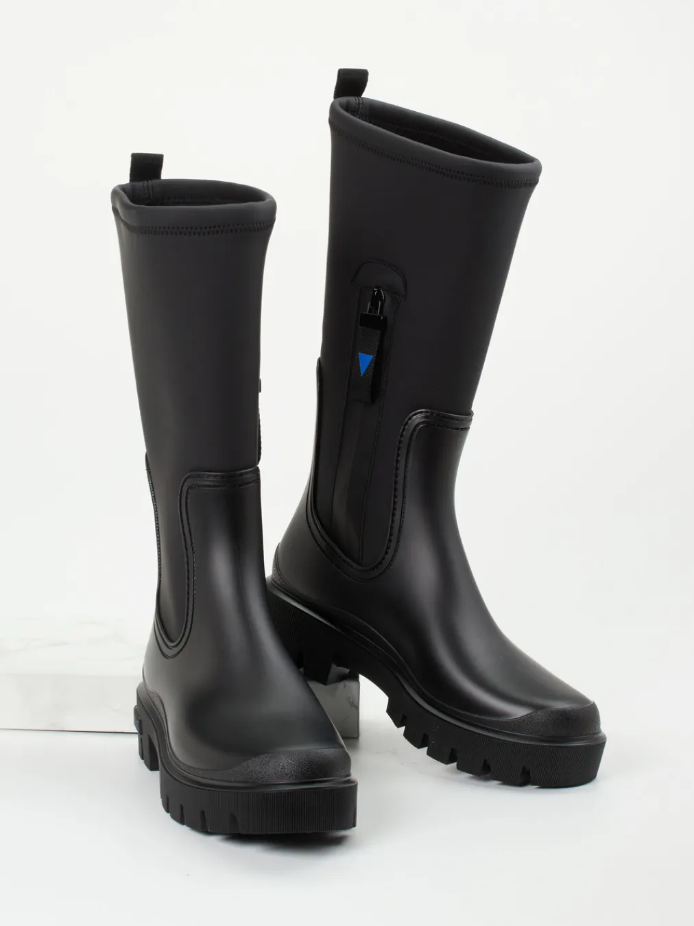 Wasserabweisendes Synthetikmaterial kombiniert mit neoprenverstärktem Schaft für funktionale Outdoor-Optik – ideal bei Regen und urbanem Wetterwandel.