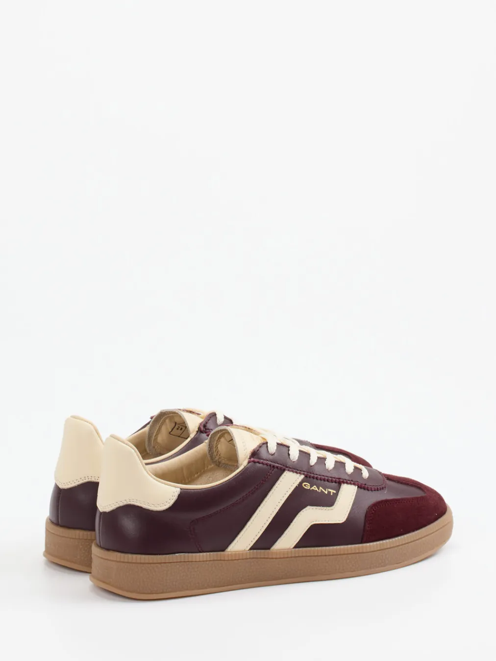 Die Kombination aus weinrotem Kalbleder und samtigem Veloursleder verleiht dem Schuh Tiefe und Struktur, während cremefarbene Kontraste und goldfarbene Logos optische Highlights setzen. Die klassische flache Silhouette mit Schnürung und verstärkter Ferse sorgt für stabilen Komfort. Eine honigfarbene, abriebfeste Gummisohle unterstreicht die Vintage-Ästhetik und garantiert Belastbarkeit im urbanen Umfeld. Inspiriert vom Streetwear der 90er und dem Color-Blocking-Trend der Saison lässt sich dieser Sneaker vielseitig zu Casual-Looks kombinieren – etwa mit Cordhose oder Sportsocken.