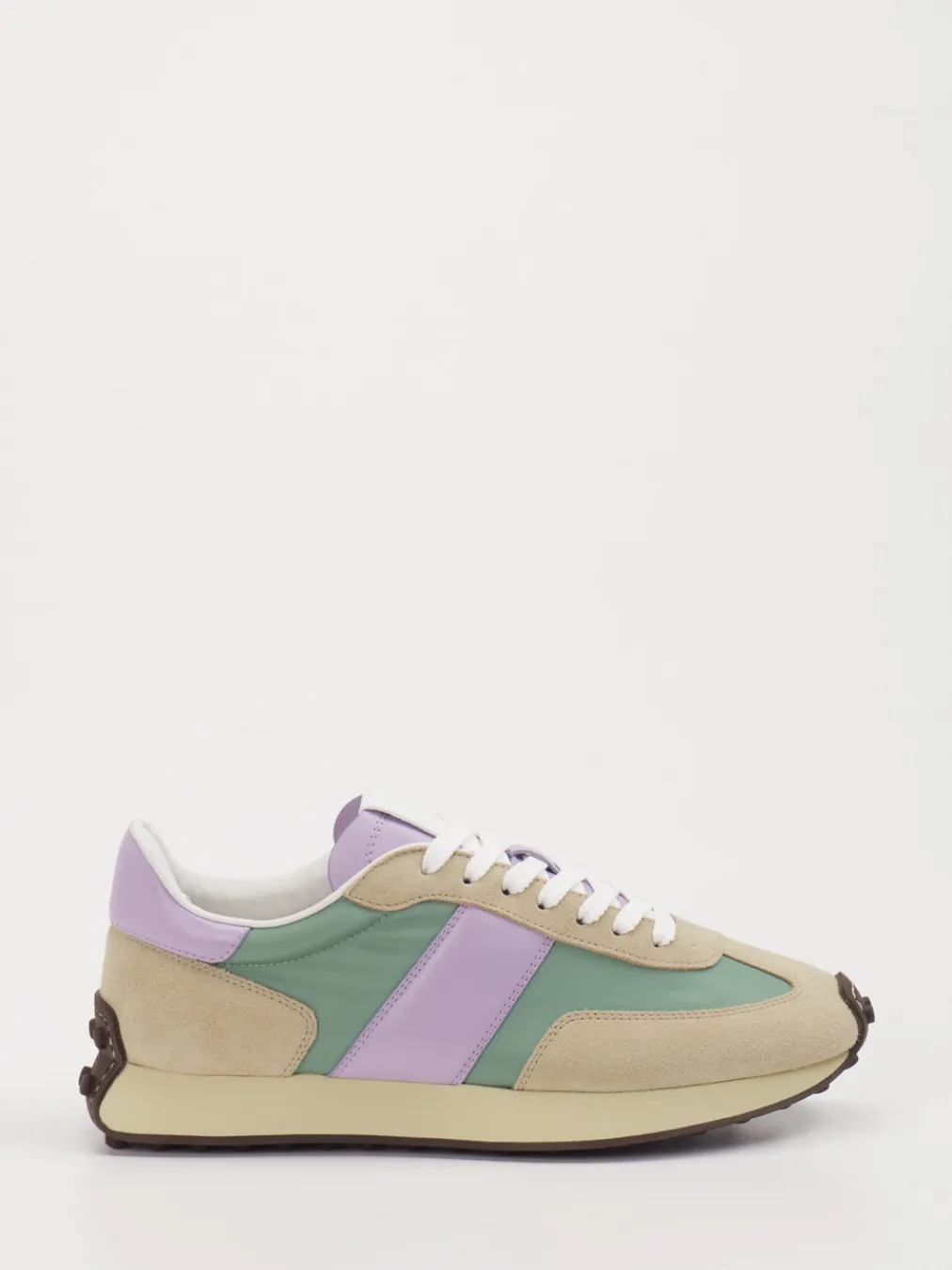 Pastelltöne neu interpretiert. Tod’s präsentiert einen modischen Sneaker im charakteristischen Retro-Stil. Für entspannte Citytouren oder den Spaziergang in der Frühlingssonne bietet dieses Modell idealen Komfort. Der Materialmix aus Veloursleder und Textil sorgt für ein angenehmes Tragegefühl bei gleichzeitig robuster Ausstrahlung. Das Design zeigt sich in Beigegrau mit kontrastierenden Einsätzen in Flieder und Salbeigrün – ein klarer Verweis auf die Pastelltrends der Saison. Die flach gehaltene, leicht keilförmige Silhouette umschließt den Fuß formschön, unterstützt durch eine profilierte Gummisohle mit Noppen. Weiße Schnürsenkel und eine gepolsterte Ferse unterstreichen den sportiven Charakter. Ideal kombinierbar mit hellen Casual-Outfits. Stilbewusster Komfort im Signatur-Stil von Tod’s.