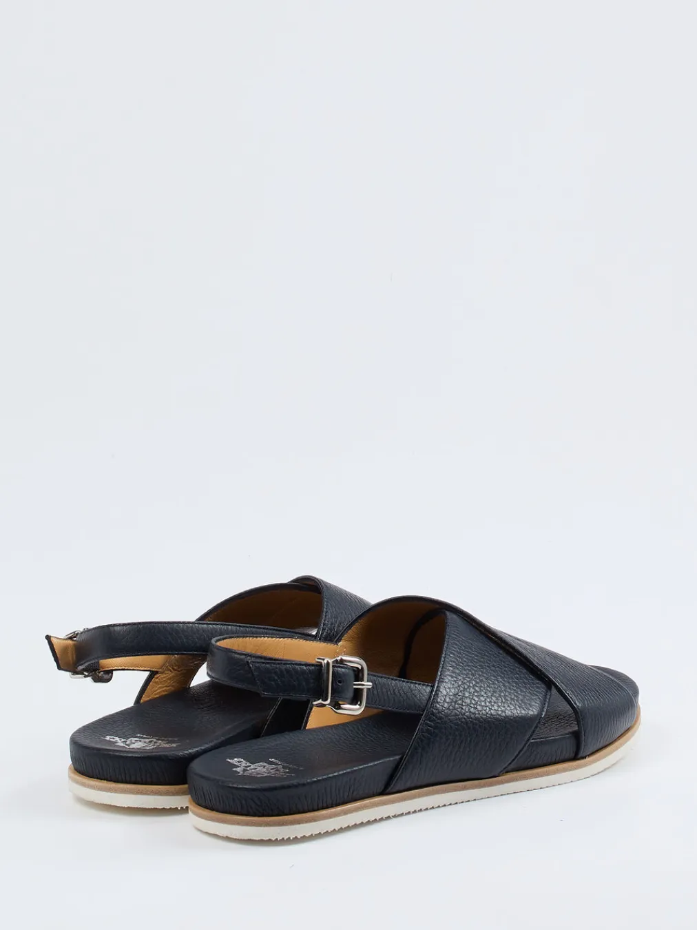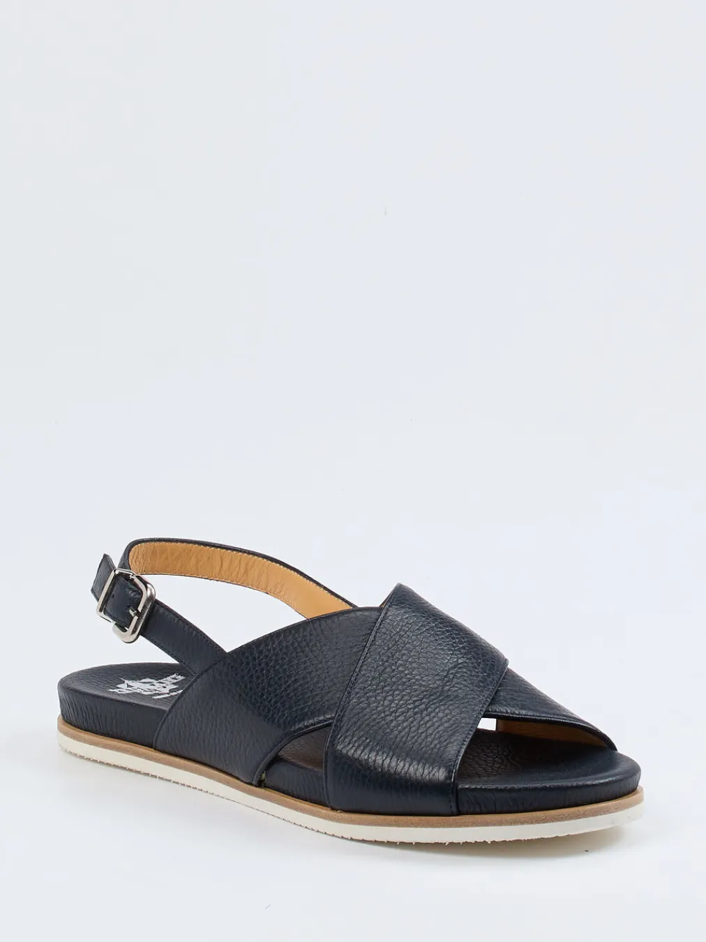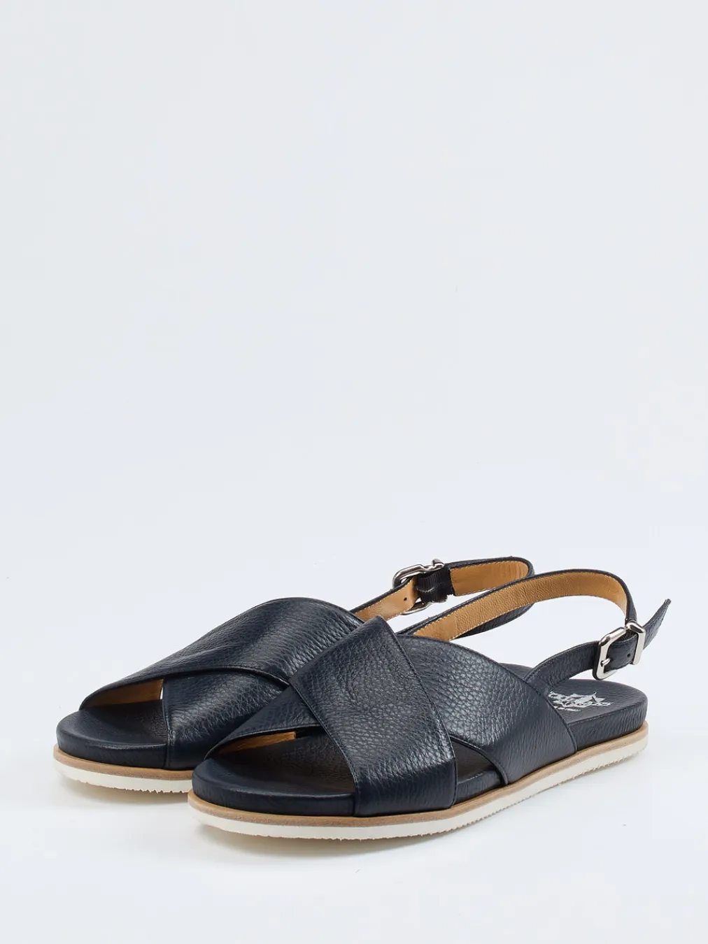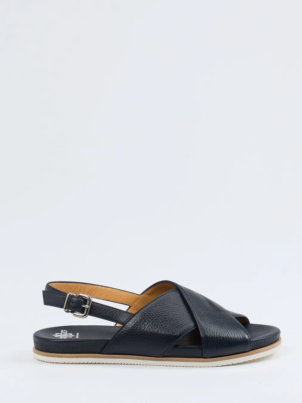Ein zeitloser Begleiter an warmen Sommertagen ist diese Sandale aus dem Hause Truman´s. Anspruchsvoll und wertig zeigt sich das dunkelblaue, weiche Hirschleder. Die gekreuzten Riemchen garantieren eine ideale Passform und einen angenehmen Halt. Durch die silberfarbene Schließe lässt sich das Fersenriemchen individuell anpassen. Das gepolsterte Tieffußbett und die bequeme Gummisohle unterstreichen den hohen Tragekomfort.