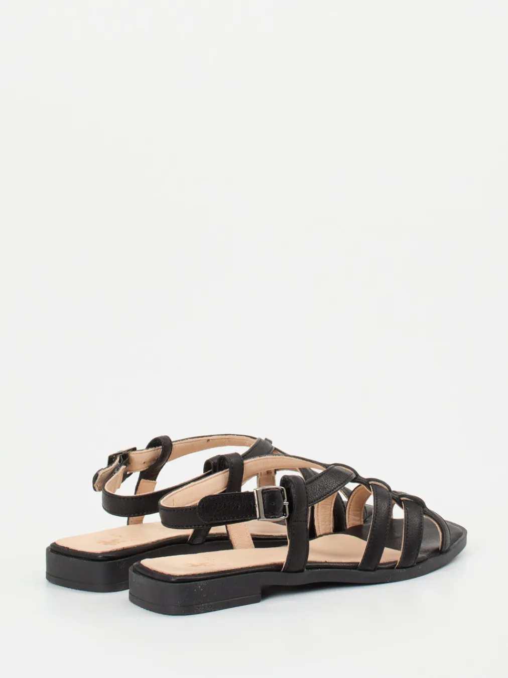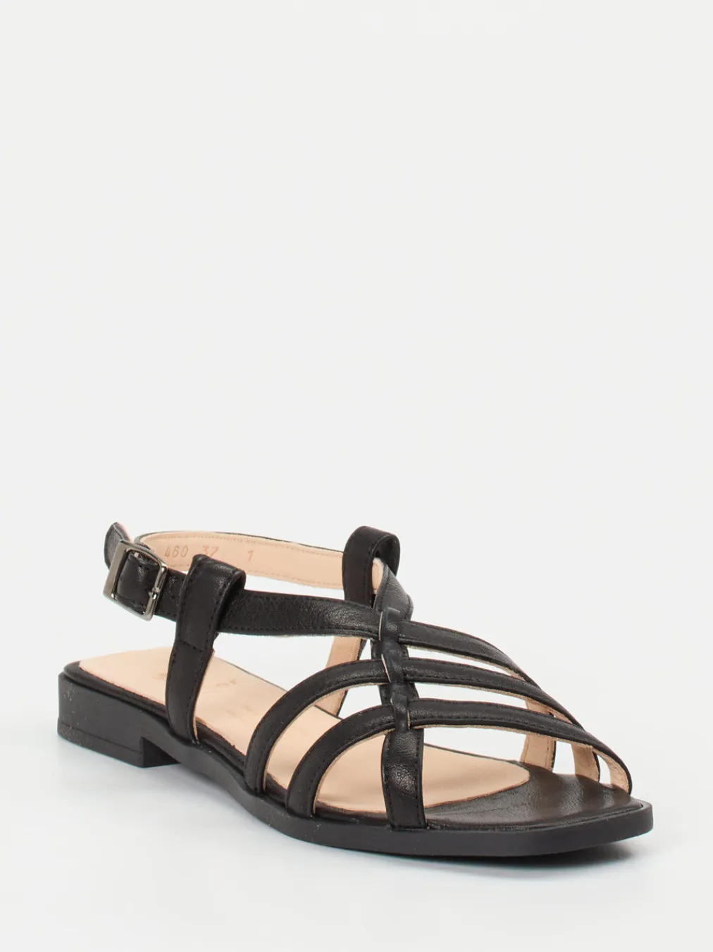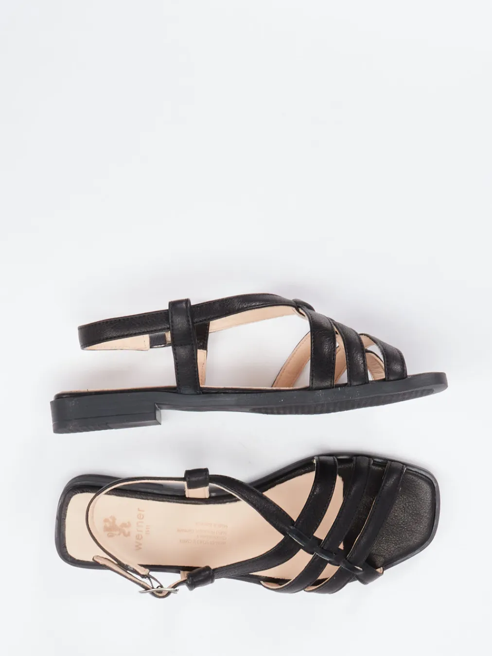 Minimalismus trifft Komfort.Werner präsentiert mit dieser Riemchensandale ein Modell für Damen, das zeitlose Eleganz im Alltag verkörpert. Ein idealer Begleiter für warme Sommertage im Stadtalltag oder auf Reisen: Die schwarze Sandale aus chromfrei gegerbtem, pflanzlich behandeltem Kalbleder überzeugt durch ihre samtig-matte Oberfläche und eine komfortable Passform. Gekreuzte Riemen sowie ein verstellbarer Fersenriemen mit silberfarbener Metallschnalle verleihen dem Design Leichtigkeit und Struktur. Die flache Gummisohle sorgt zusammen mit dem lederbezogenen Fußbett für Flexibilität und angenehmes Laufgefühl. Im Geist von „Quiet Luxury“ lässt sich das Modell ideal zu einer Leinenhose oder edler Resortwear kombinieren. Komfortabel und langlebig – mit ökologisch durchdachtem Markenanspruch.