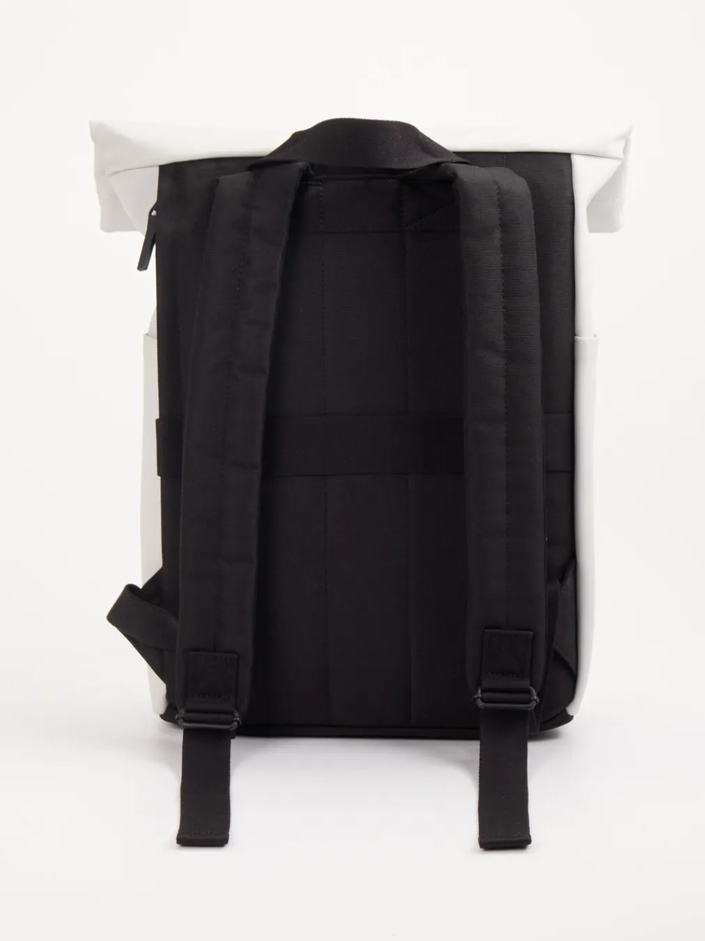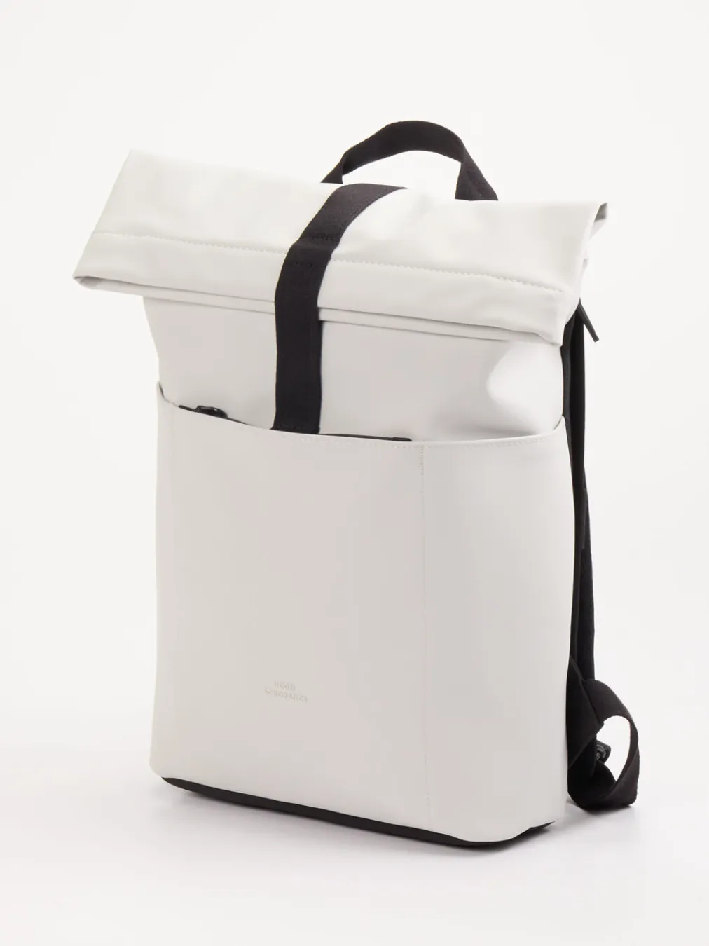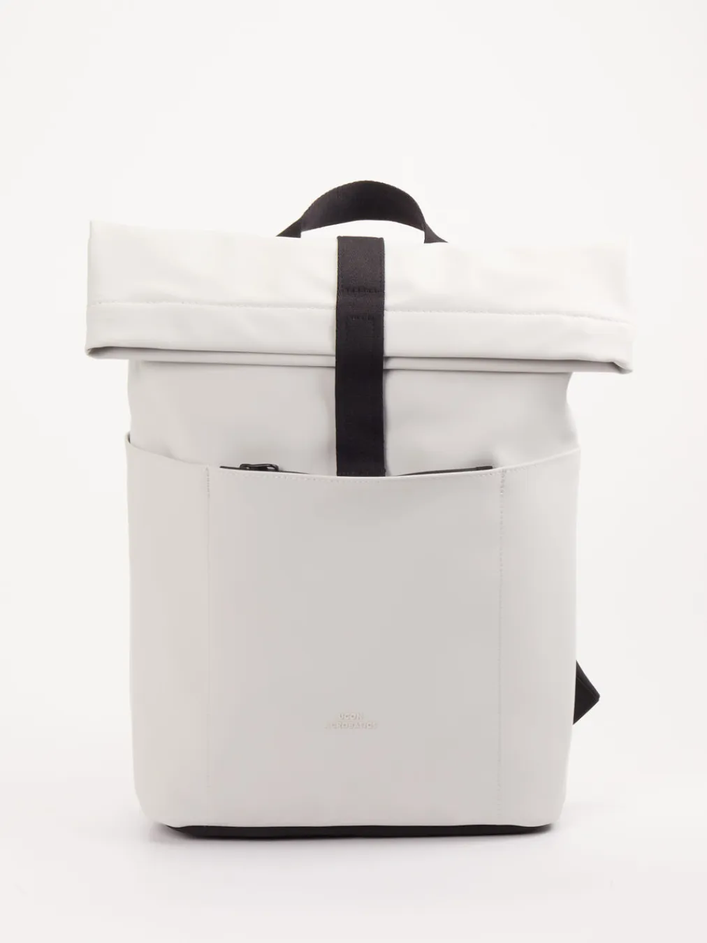 Nachhaltig, vegan und absolut stylish! Das Berliner Label Ucon Acrobatics präsentiert diesen Rucksack in der Form Hajo Mini. Das vegane Tech-Obermaterial hat eine weiche Haptik und überzeugt mit seiner unkomplizierten Farbgebung in Offwhite. Alle Stoffe sind wasserdicht. Der Roll-Top schließt mit Klettverschluss und ermöglicht ein praktisches Befüllen des Hajo Backpacks. Über einen vertikalen Reißverschluss ist der Zugriff auf das Hauptfach ganz leicht. Zwei außenliegende Eingriffstaschen bieten Platz für Regenschirm oder Trinkflasche. Ein klimabewusster Allrounder für Ihren Alltag und jede Gelegenheit! – Obermaterial: 36% Polyurethane (PU), 40% Polyester (PET), Kalziumcarbonat 14%, 10% Holzfasern – Futter: 100% recyceltes Polyester – Farbe: Offwhite – Größe: ca. 40 x 35 x 10 cm (H x B x T) – Rückengurt: ca. 70 cm, verstellbar – Henkel: ca. 20cm – Verschluss: Reißverschluss, Klettverschluss – Innen: Innenfach passend für ein 16,4″ Laptop, zwei Steckfächer – Außen: Tasche…