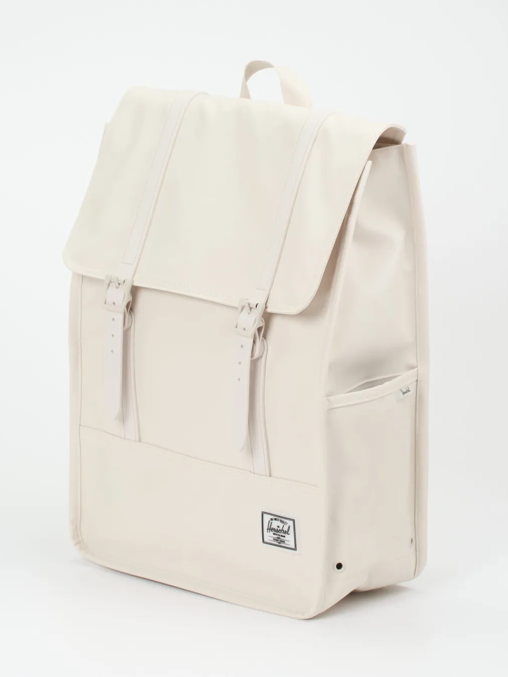 Dieser Rucksack der Marke Herschel zeigt sich nachhaltig in einem Material aus 100% recycelten Bestandteilen. Das helle Beige zeigt sich vielseitig kombinierbar und frisch für Frühling und Sommer. Besonders praktisch ist die gepolsterte Laptoptasche im Innenraum, in der bequem ein Laptop der Größe 15‘‘/16‘‘ transportiert werden kann. Verschlossen wird der Rucksack mit zwei magnetischen Druckknöpfen. Außerdem bietet der Rucksack nicht nur Stauraum in Innenraum, sondern auch zwei seitliche Fächer für Wasserflaschen. – Material: 100% PET – Farbe: Beige – Größe: ca. 40 x 30 x 16 cm (H x B x T) – Schulterriemen: Länge ca. 70 cm, verstellbar – Verschluss: Wasserfester Reißverschluss