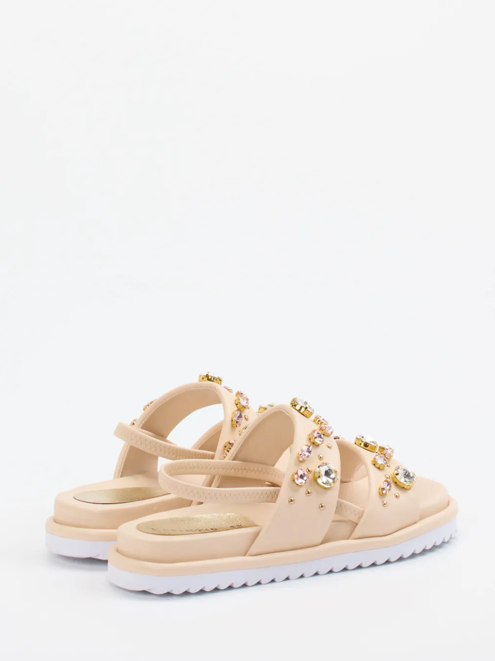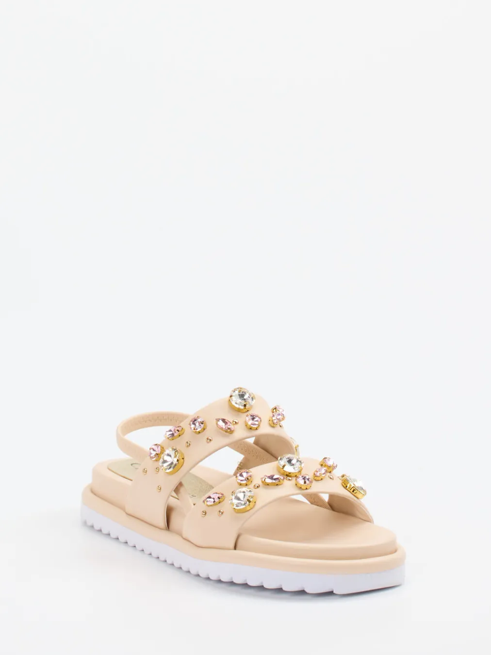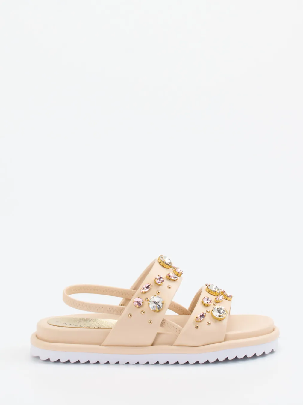 Diese CAFèNOIR Sandalen bringen feminine Eleganz in sommerliche Looks – hochwertiges Kalbleder trifft auf funkelnden Strass in goldfarbenen Fassungen.