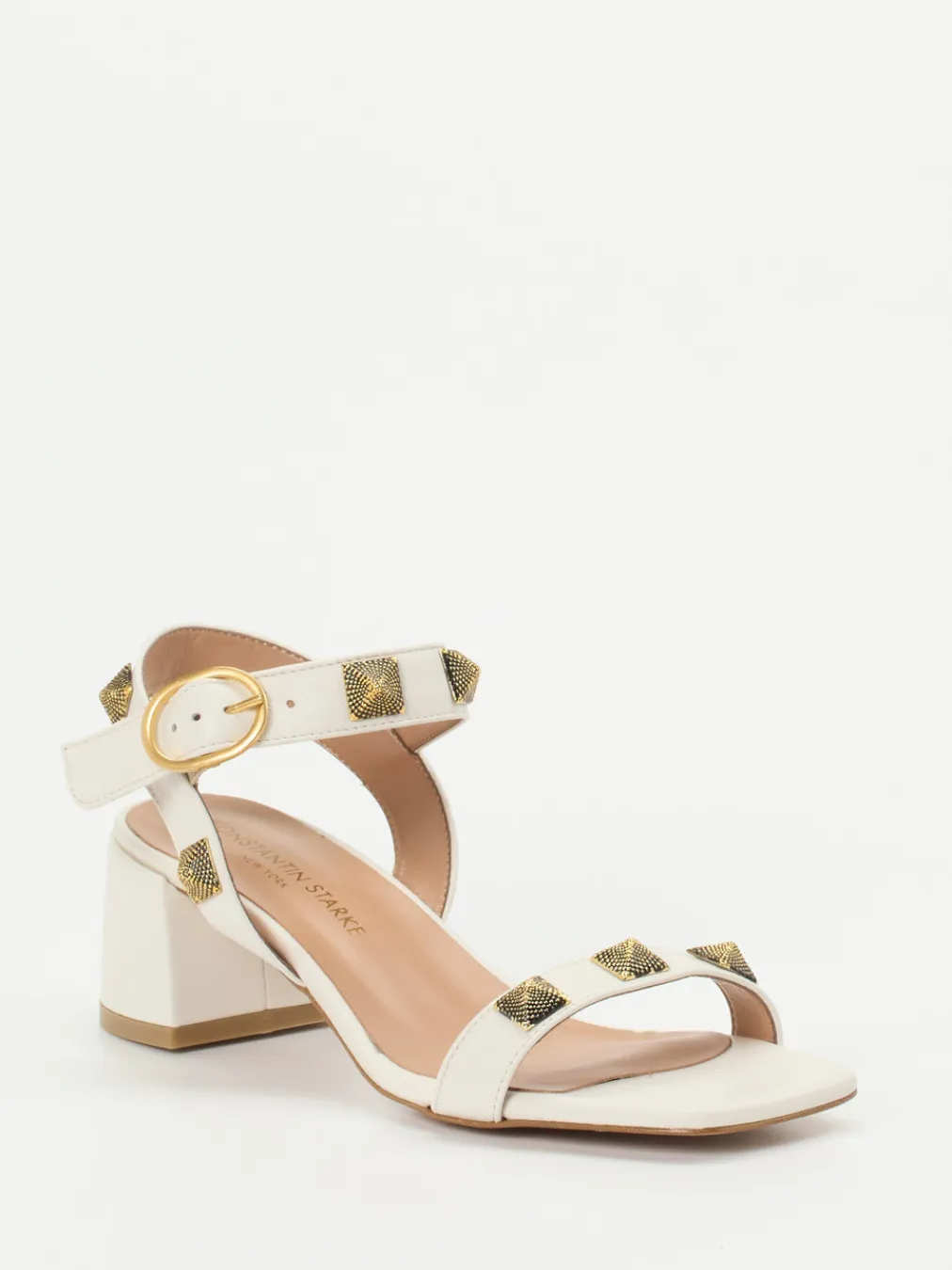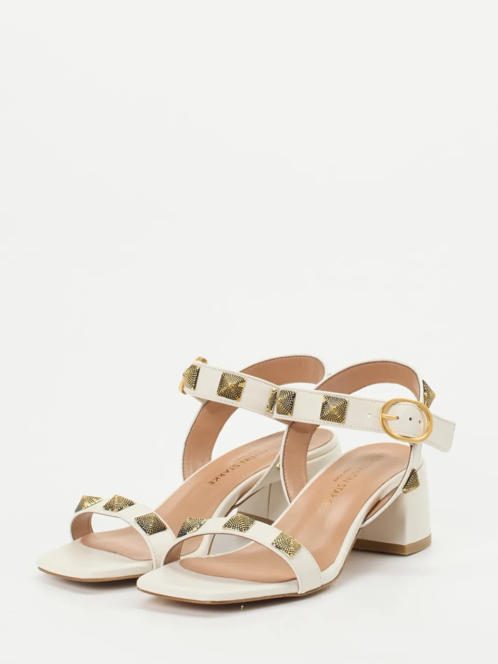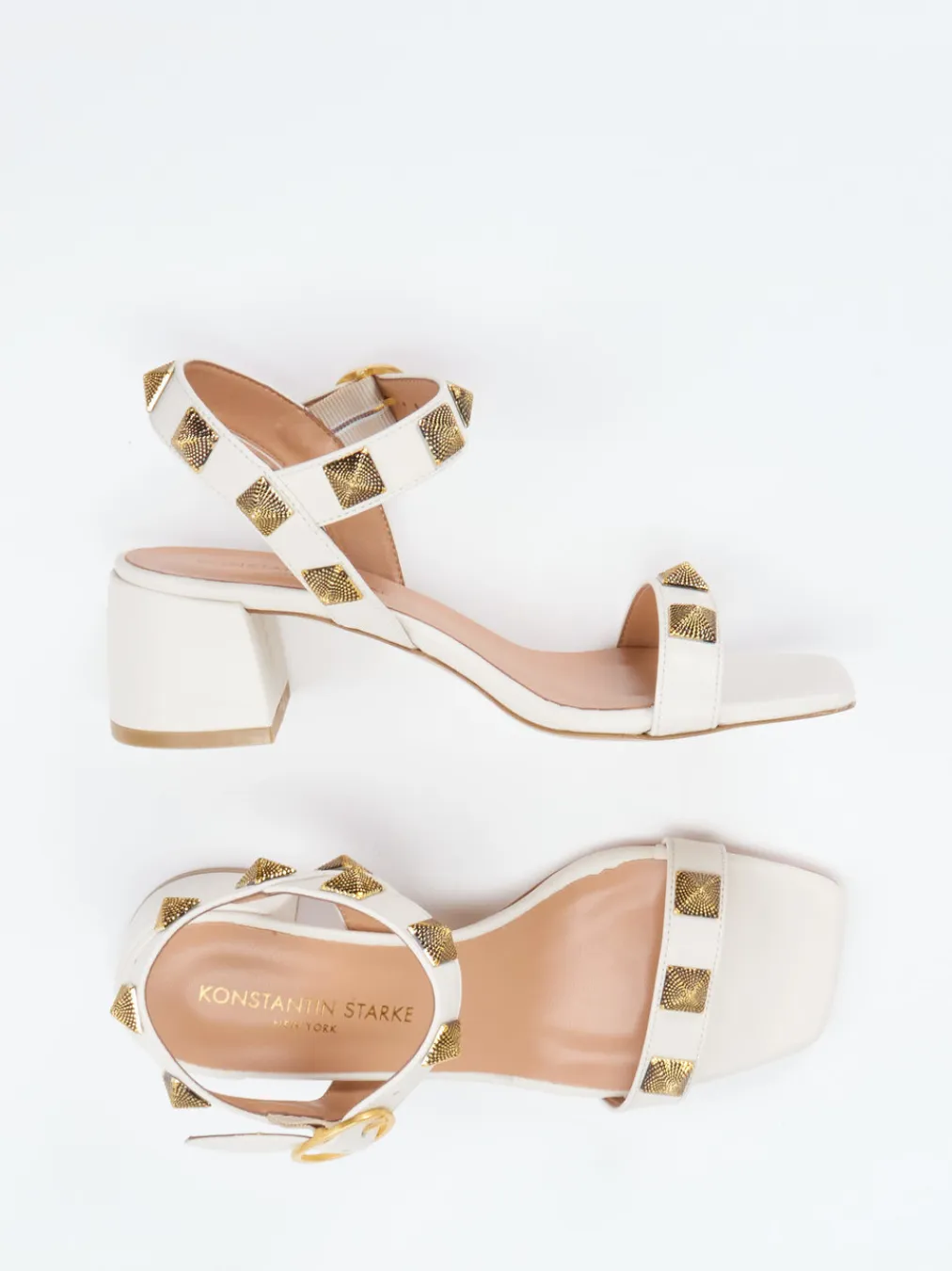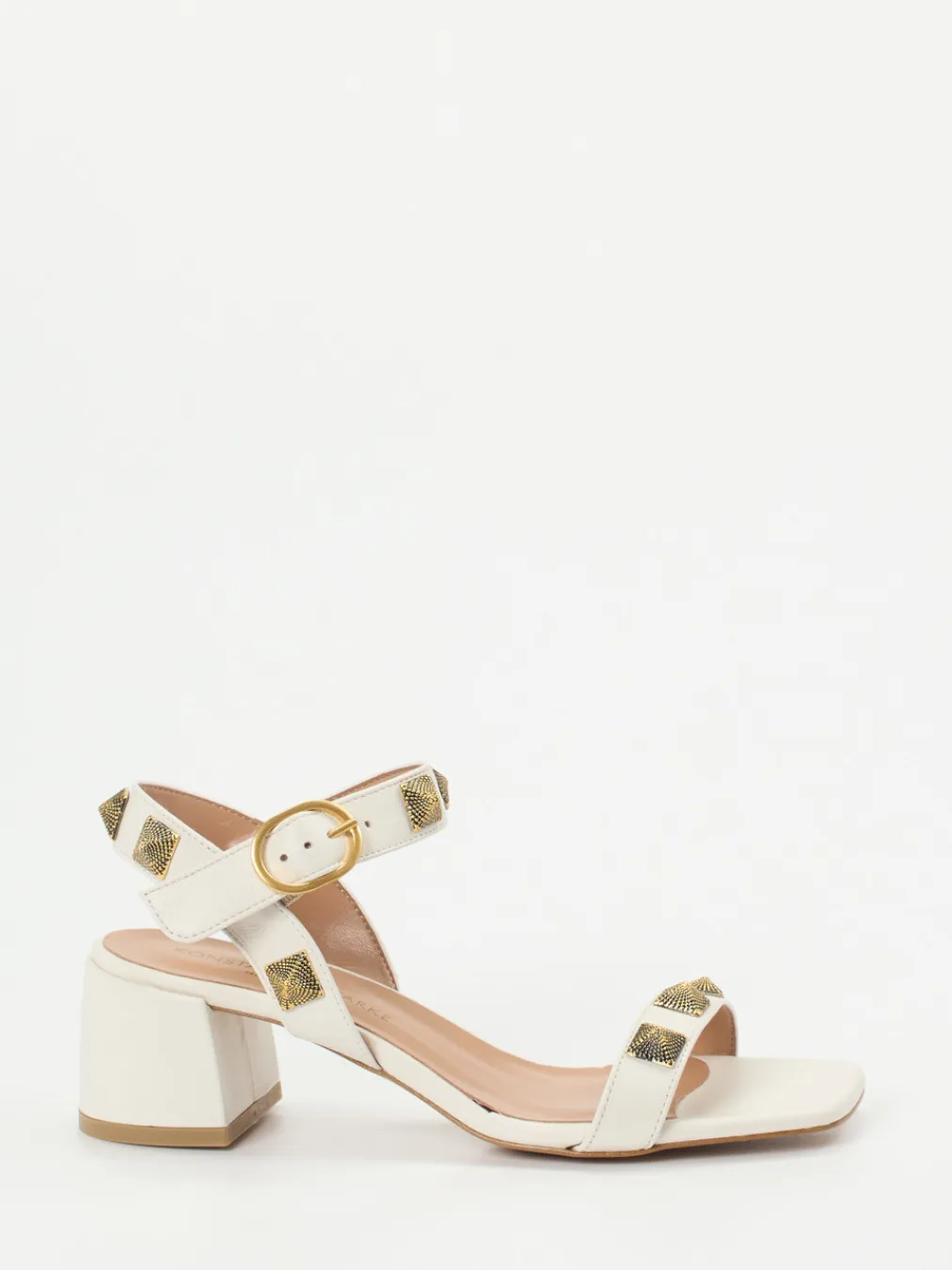 Ideal für festliche Anlässe oder stilvolle Alltagssituationen kombiniert das Modell hochwertiges, mattes Lammleder in cremigem Offwhite mit auffälligen, goldfarbenen Pyramidennieten. Der verstellbare Knöchelriemen mit goldener Dornschließe und der lederbezogene Blockabsatz sorgen für sicheren Sitz und angenehme Laufhöhe von 4,5 cm. Die offene Carréform und die geradlinige Silhouette setzen dezente Vintage-Akzente mit aktuellem Trendbezug. Kombinierbar mit leichten Sommerkleidern oder Metallic-Accessoires.