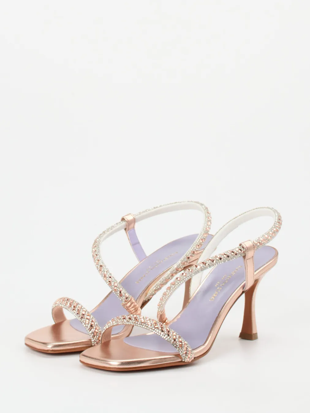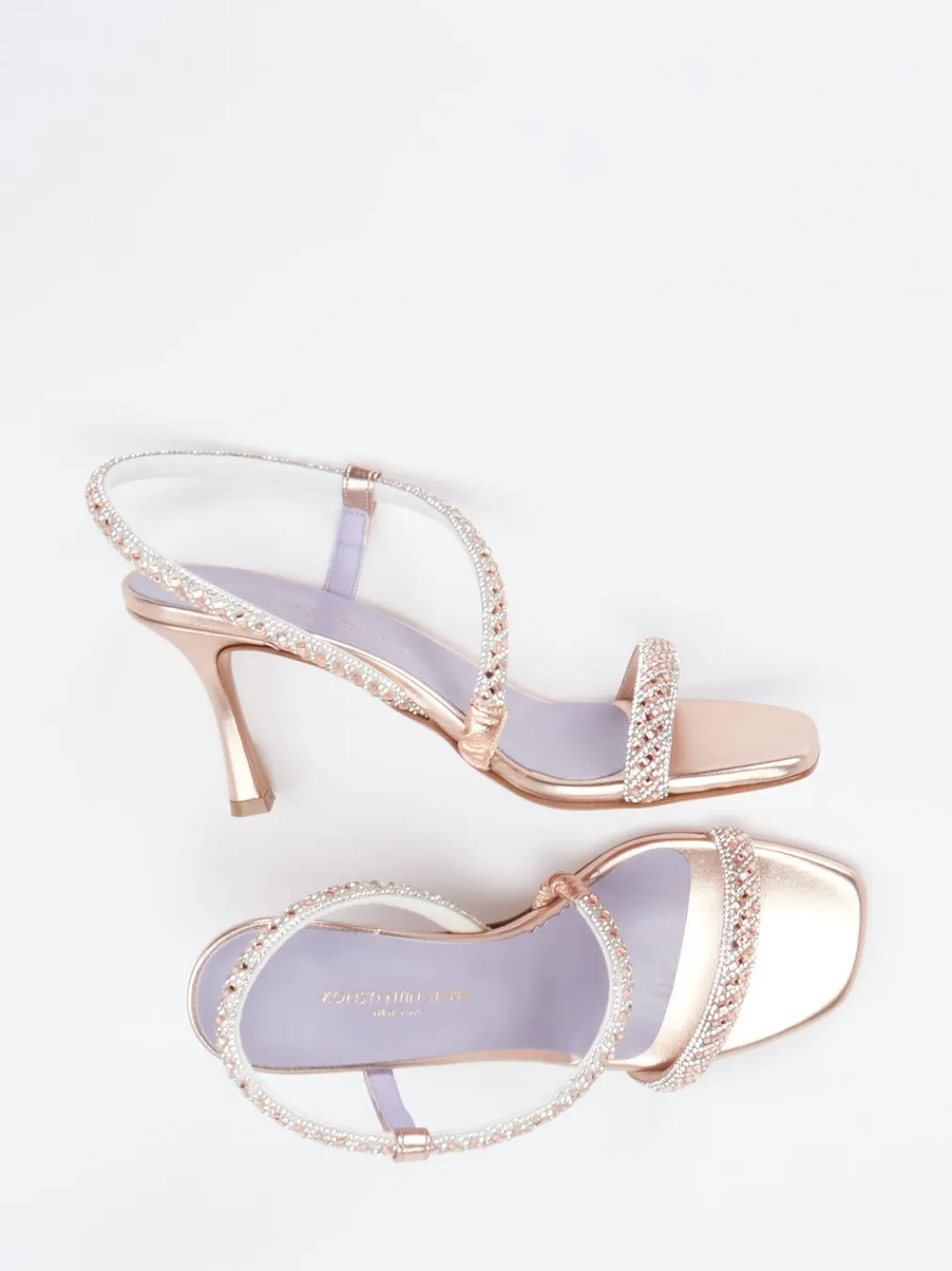 Die Damen-Sandalette von Konstantin Starke verbindet hochwertiges Metallicleder mit einer glänzenden Ausstrahlung in softem Roségold. Strassbesetzte Riemchen setzen funkelnde Akzente und betonen die feminine Silhouette auf stilvolle Weise.
