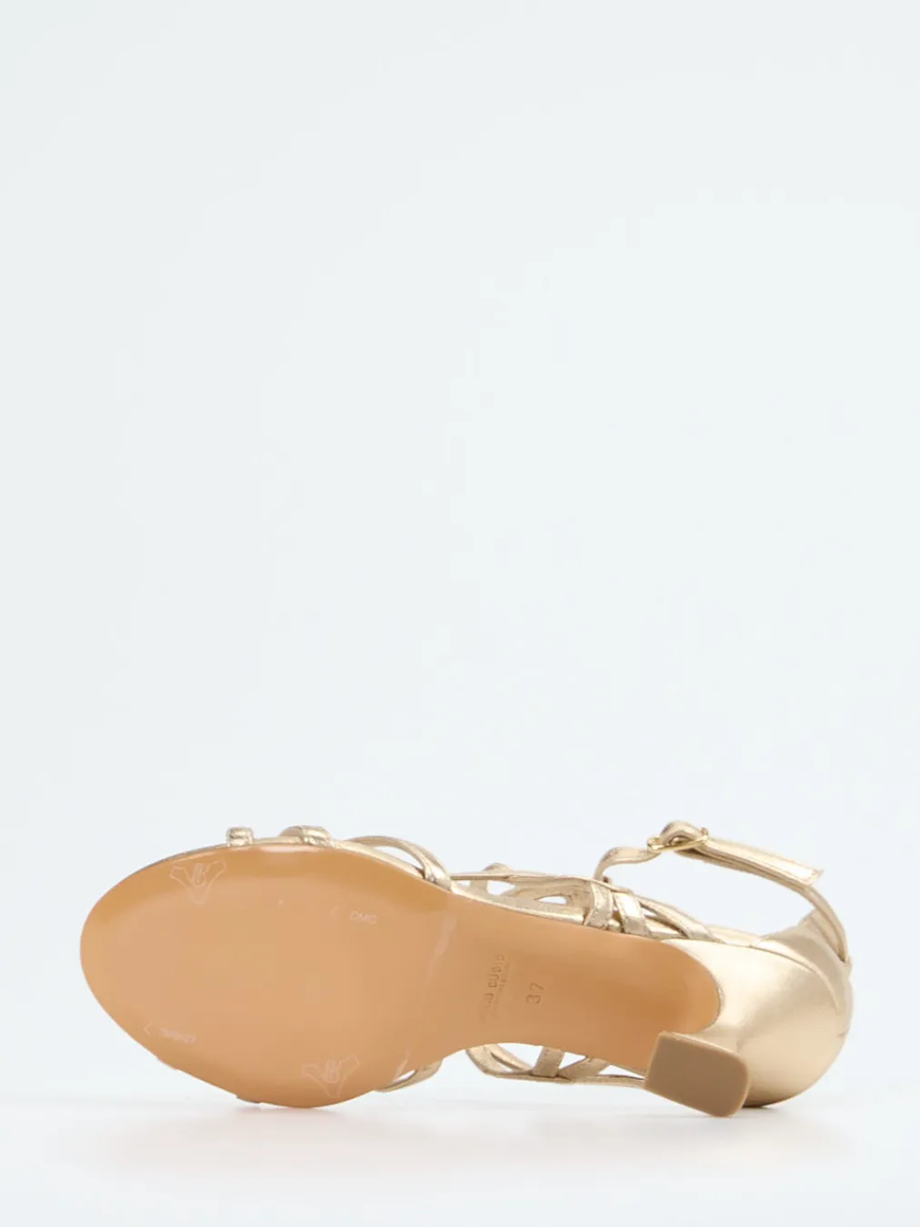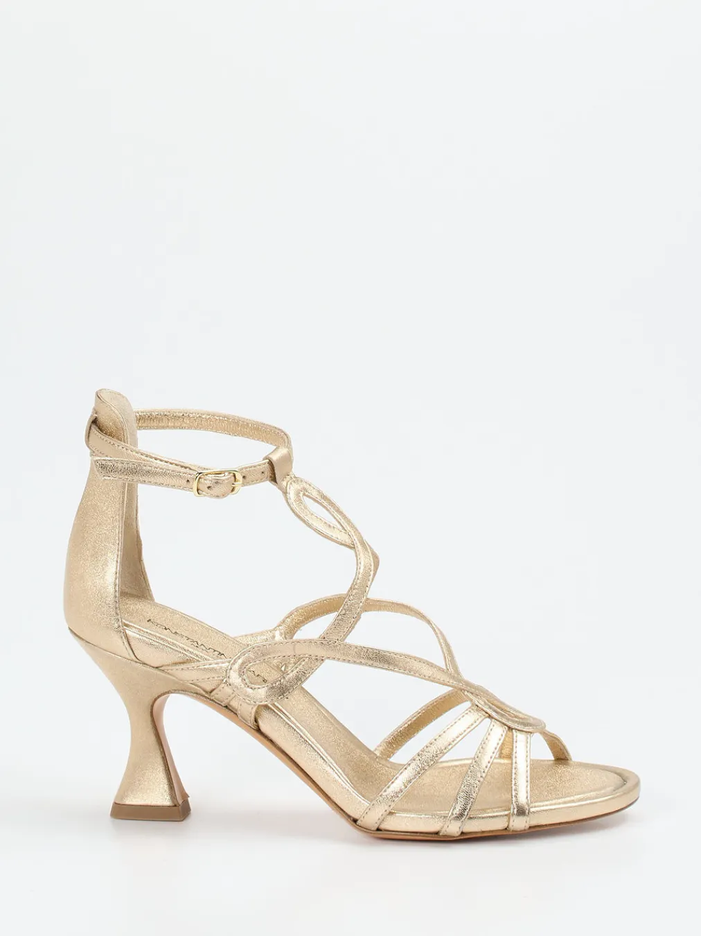 Glänzendes Metallicleder trifft auf skulpturalen Absatz – diese Sandalette verbindet Retro-Chic mit zeitgemäßem Strappy-Look.