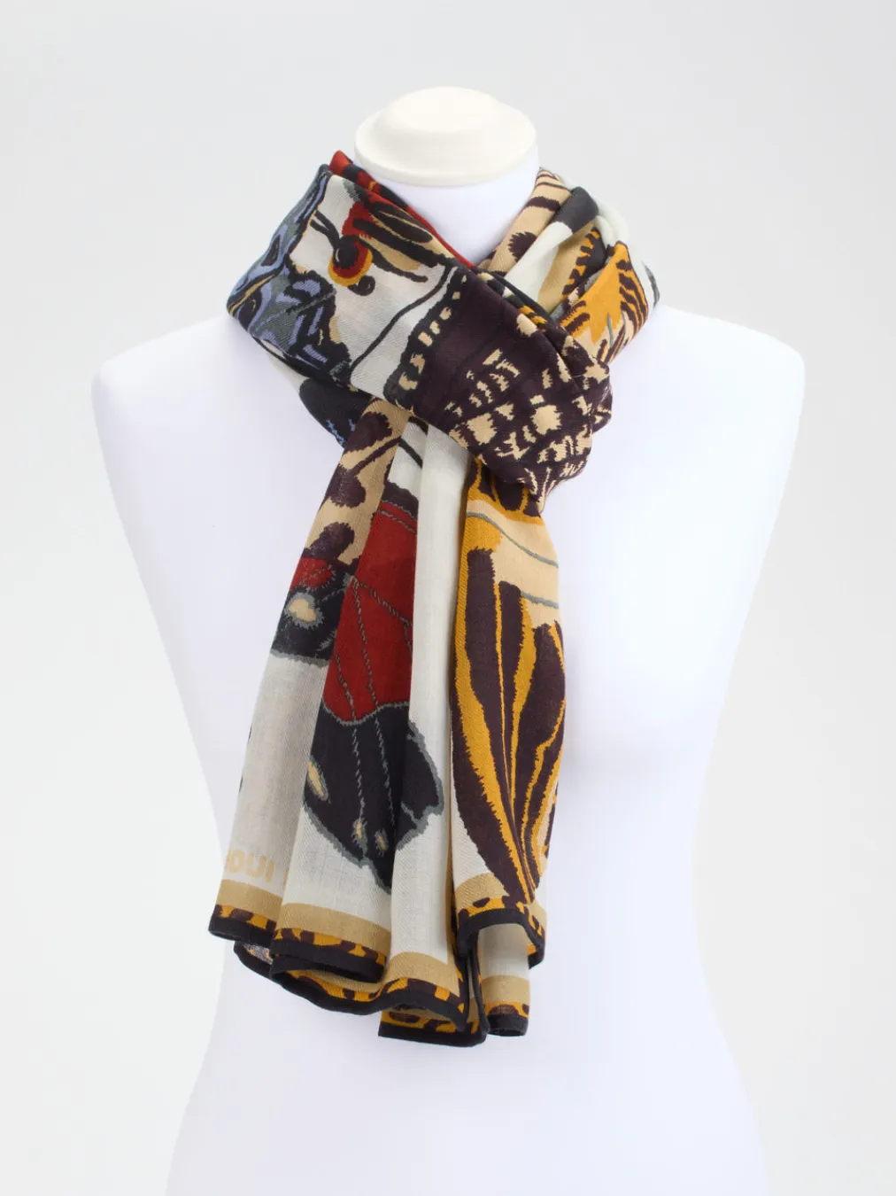 Leichter Wollschal mit kunstvollem Schmetterlingsdesign in warmen Farbtönen – eine stilbewusste Wahl für Freizeit-Ensembles und saisonale Trend-Looks.