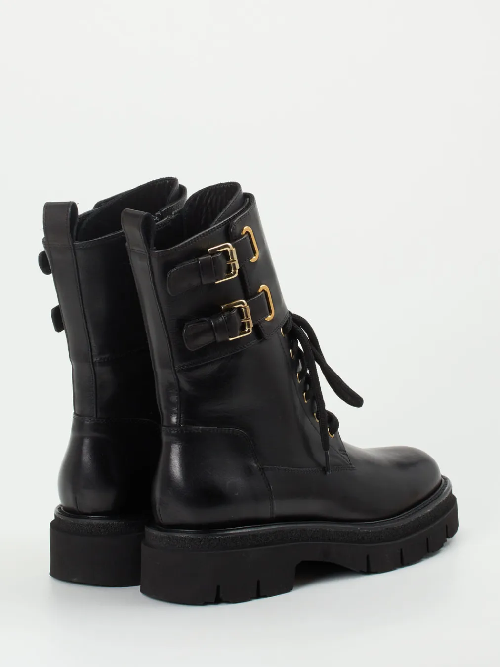 Funktionalität mit Stilanspruch.Die Marke Mannori präsentiert Damen-Schnürboots mit urbaner Ästhetik und modischem Feinschliff. Für herbstliche Citywalks oder legere Events bietet das schwarze Kalbleder mit glänzender Oberfläche ein ausdrucksstarkes Finish. Goldfarbene Schnallen und Ösen setzen stilvolle Akzente, während die klassisch-hohe Form mit Reißverschluss an der Innenseite alltagsfreundlich bleibt. Die markante Leichtzellsohle mit Chunky-Profil verleiht Stabilität und unterstreicht den Utility-Charakter. Kombinierbar mit Lederjacke oder Oversized-Mantel für einen stilsicheren Look. Ein Statement-Boot, der handwerkliche Wertigkeit mit Trendbewusstsein vereint.