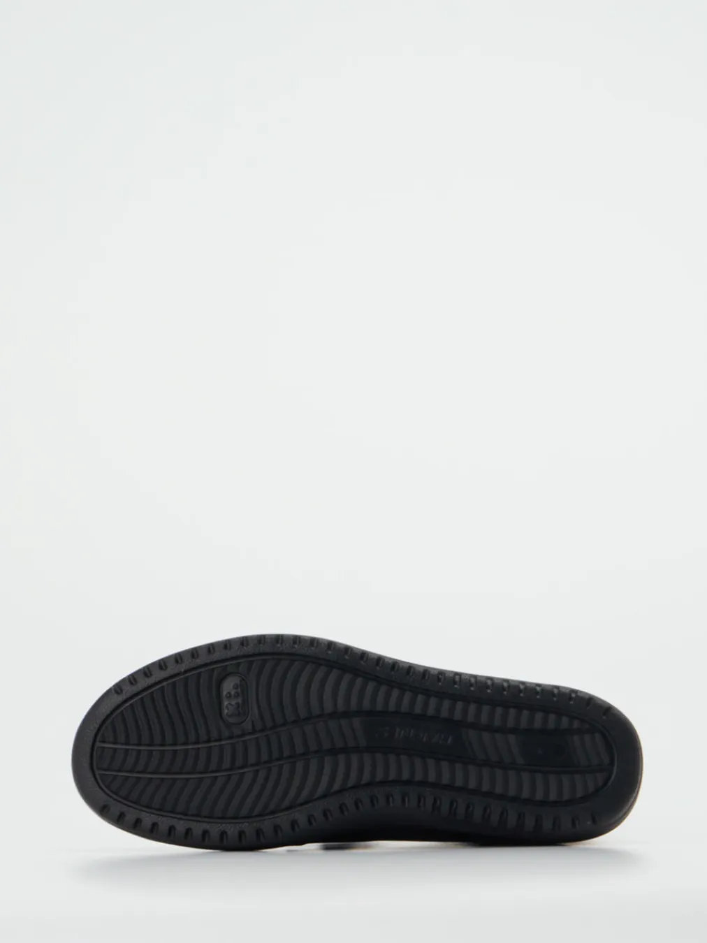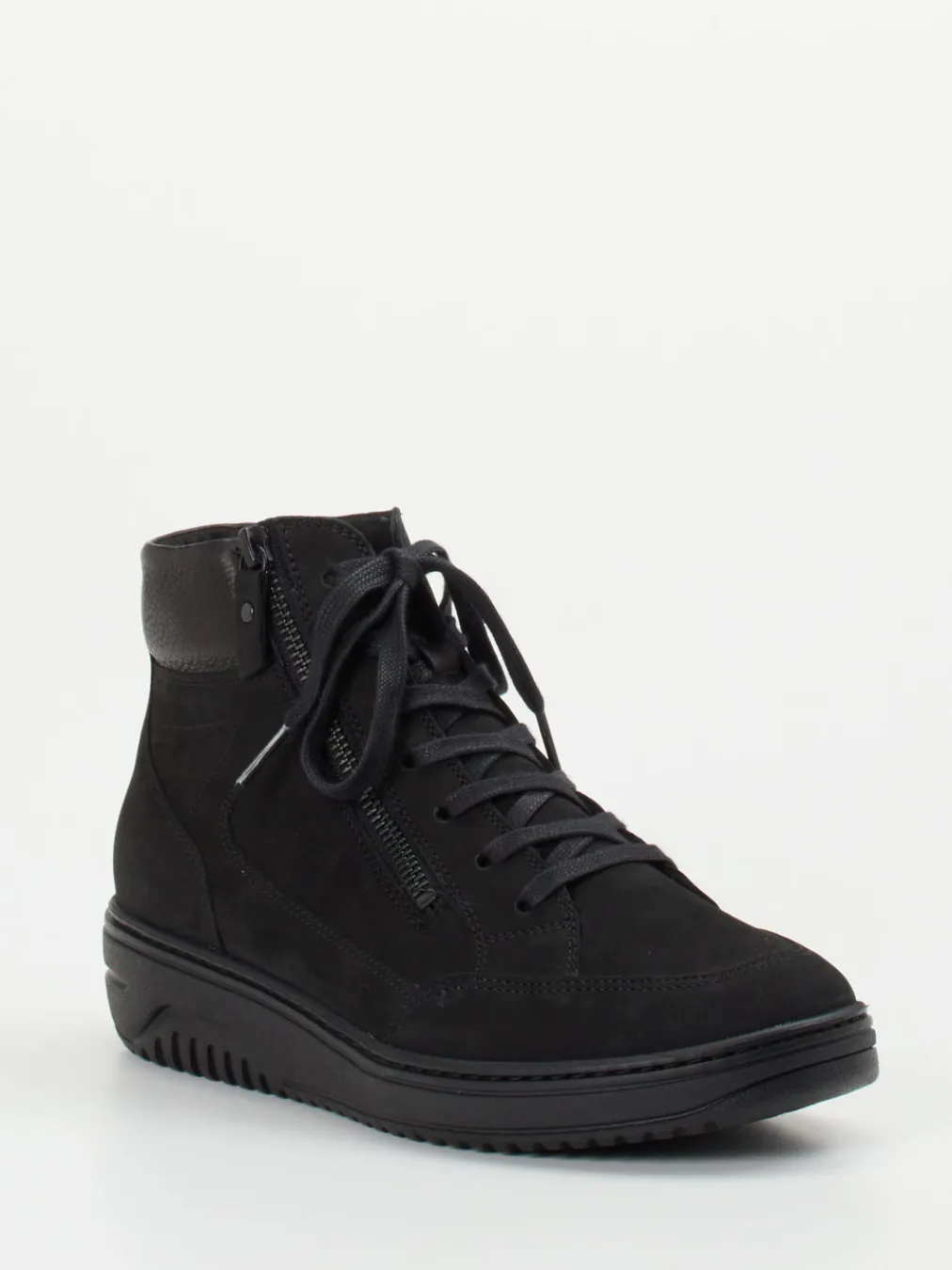 Dieser High-Top-Sneaker überzeugt mit schwarzem Nubukleder, tonigem Finish und hohem Tragekomfort dank gepolstertem Schaft und keilförmiger Gummisohle.
