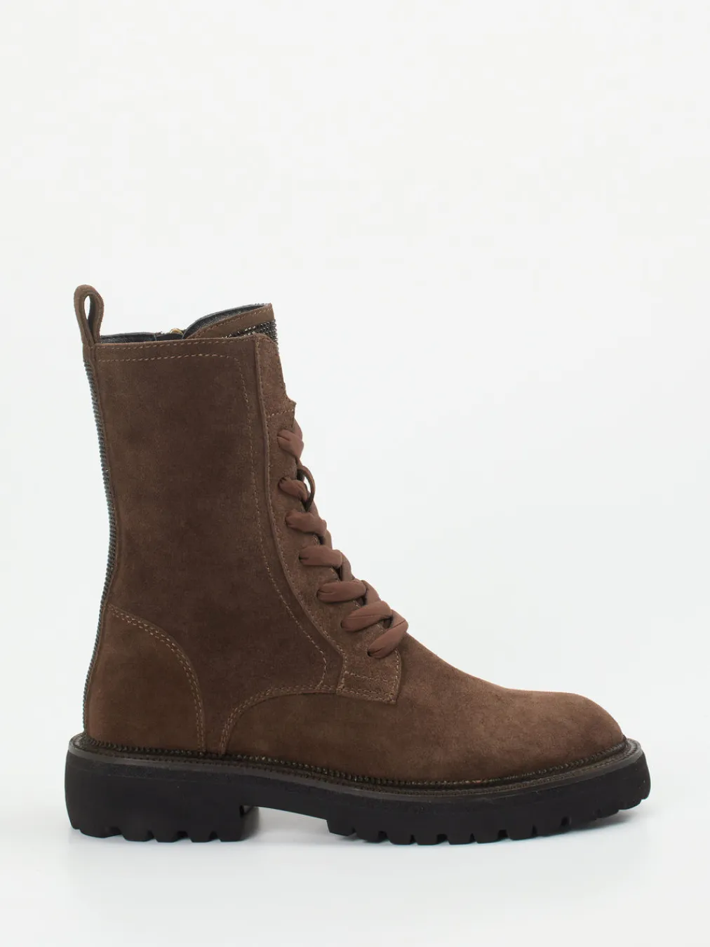 Für kühlere Tage im Alltag oder beim Spaziergang im Park bietet diese knöchelhohe Stiefelette aus mittelbraunem Veloursleder mit matter Oberfläche den passenden Komfort. Die Gummisohle mit markantem Profil sorgt für sicheren Tritt im urbanen Terrain. Ein seitlicher Reißverschluss erleichtert den Einstieg, während ein Glitzereinsatz an der Ferse femininen Akzent setzt. Insgesamt dominiert eine lässige, robuste Silhouette mit Ton-in-Ton-Nähten und Utility-inspiriertem Design. Besonders gut kombinierbar zu herbstlichen Looks mit Parka und Grobstrick.