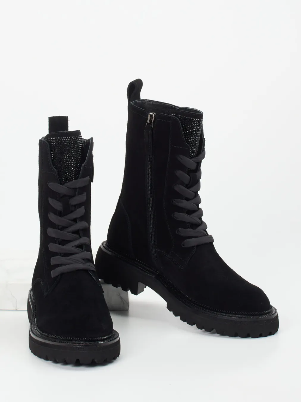 Robust trifft auf Glanz.Maripé präsentiert stilvolle Damen-Schnürboots für Herbst und Winter. Ideal für den alltäglichen Stadtbummel oder nächtliche Ausgehmomente kombinieren diese knöchelhohen Boots schwarzes Veloursleder mit einer samtig-matten Oberfläche und funktionalem PU-Blockabsatz. Der dezente Glitzerbesatz an Zunge und Fersenstreifen bringt stilvolle Raffinesse ins Design, während die profilierte Sohle sicheren Halt bietet. Dank Schnürung und Innenreißverschluss ist der Einstieg komfortabel. Inspiriert von Utility-Ästhetik und dem Subtle-Sparkle-Trend sind diese Boots ein Trend-Update für trendorientierte Streetstyle-Looks. Authentisches Design und hochwertiger Komfort – Maripé verbindet beides gekonnt.