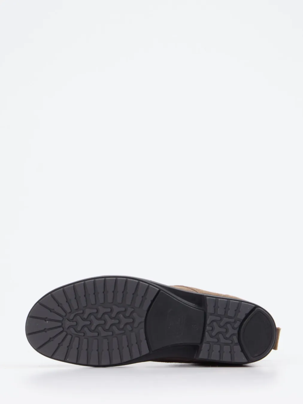 Ob für Spaziergänge durch den Park oder stilvolle Freizeitlooks – das Modell kombiniert samtig angeschliffenes Veloursleder in Taupe mit tonigen Nähten und einem dezenten Metall-Logo. Die klassische, knöchelhohe Silhouette harmoniert mit der praktischen Zuglasche hinten sowie einer rutschfest profilierten Gummisohle. Minimalistische Designansätze und Elemente des Heritage-Stils machen den Schuh besonders anpassungsfähig. Stilvoll zur Chino und Kaschmirpullover kombinierbar.