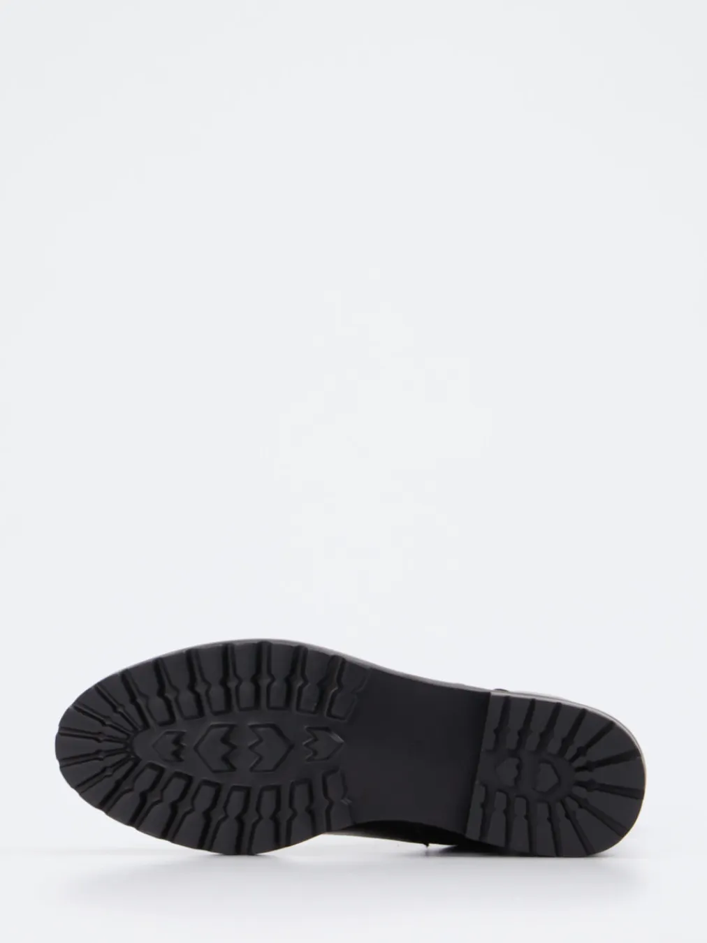 Gefertigt aus schwarzem Kalbleder mit glatter, leicht glänzender Oberfläche, vereint dieses hochschaftige Modell klassische Combat-Boots-Anleihen mit modernem Streetwear-Appeal. Silberfarbener Seitenreißverschluss und eine profilierte Gummisohle geben dem Look präsente Utility-Akzente. Innen sorgt wärmendes Textilfutter für Komfort an kühleren Tagen. Perfekt kombinierbar mit Lederjacke und Crossbody Bag – ein stilistisches Upgrade für herbstliche City-Outfits.