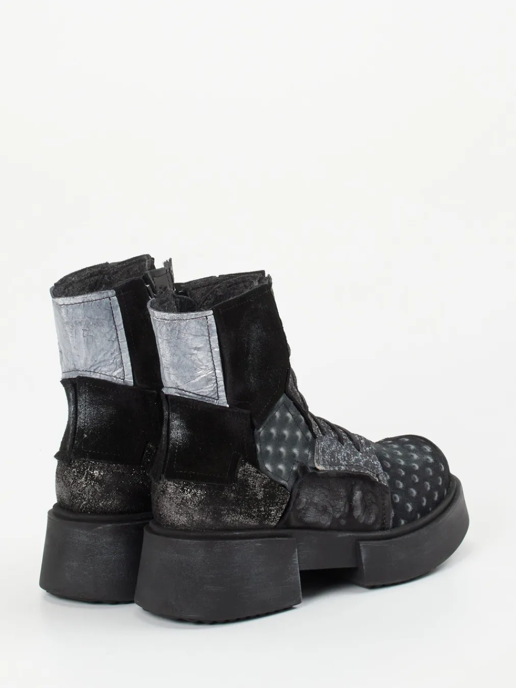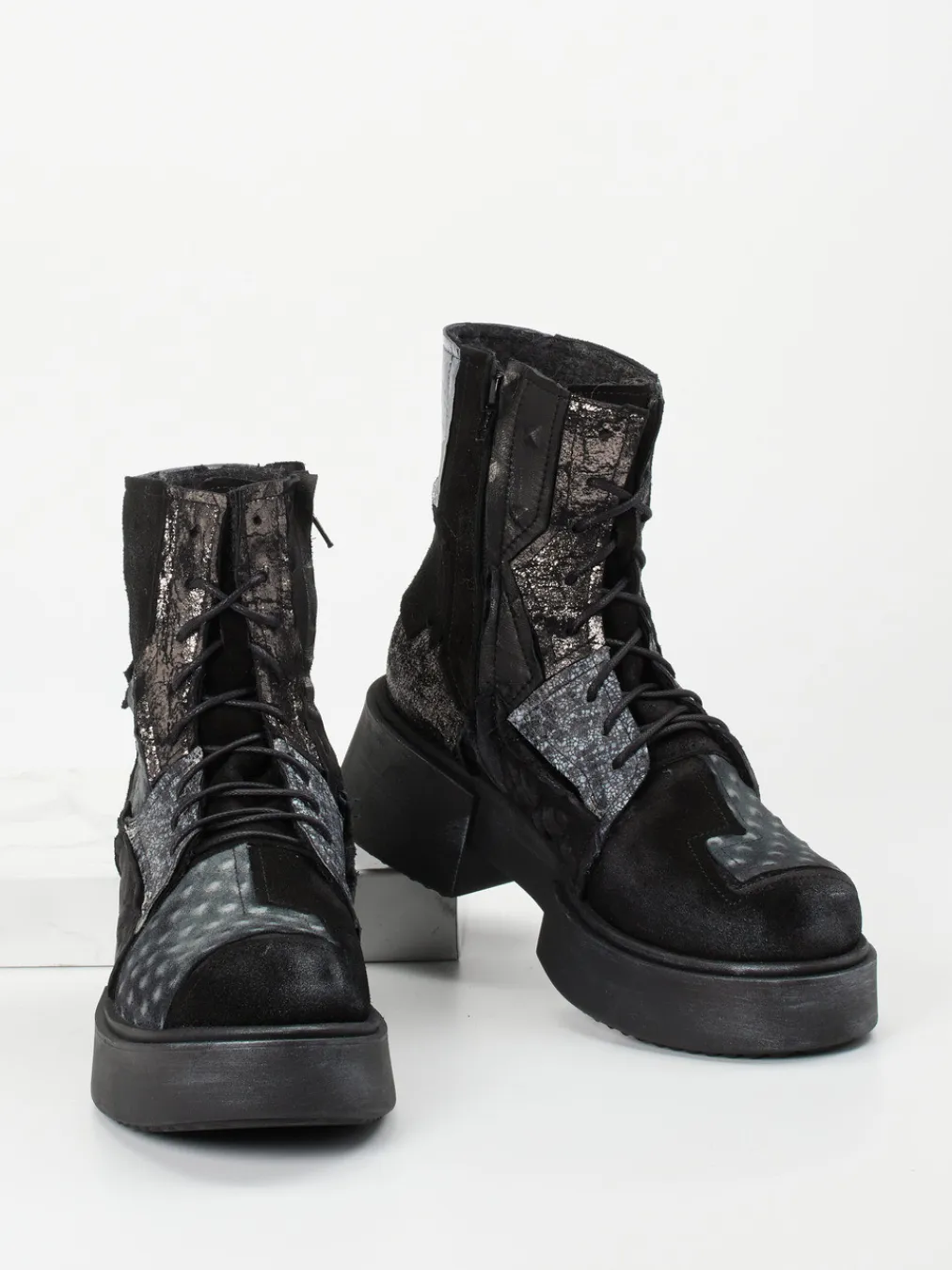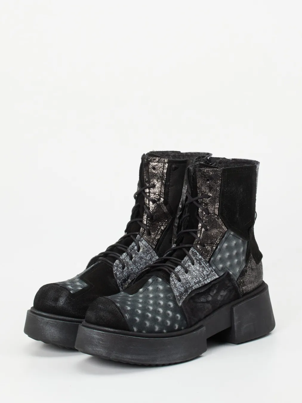 Avantgardistische Schnürstiefelette mit extravagantem Patchwork-Look, changierender Metallic-Oberfläche und strukturstarkem Materialmix – ein stilistisches Statement für Trendsetter:innen.