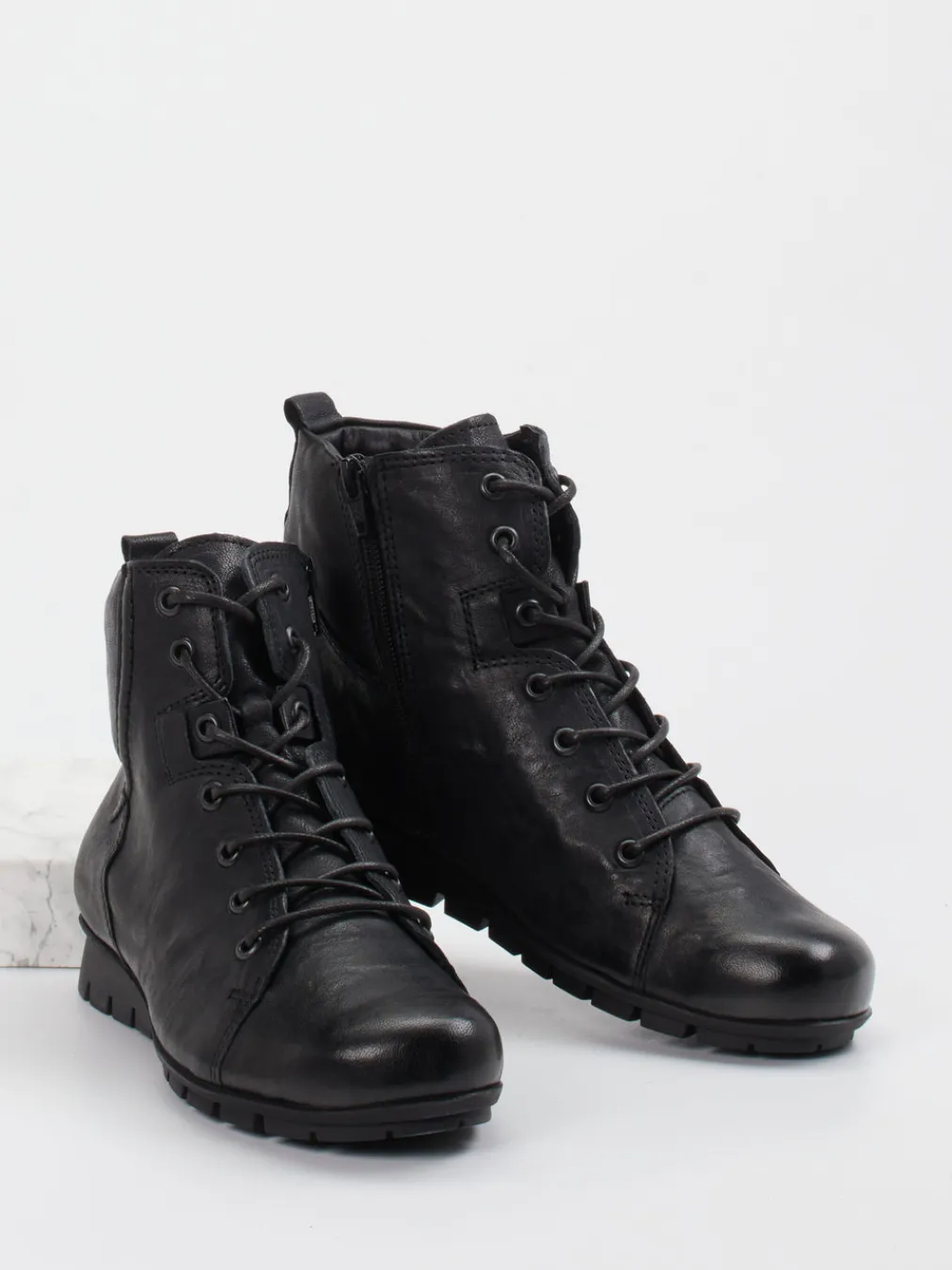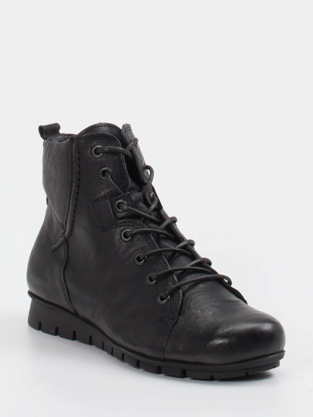 Komfort trifft urbanen Minimalismus.Think bietet mit dieser Damen-Schnürstiefelette ein alltags- und outdoortaugliches Modell für die kühle Saison. Die aus hochwertigem Ziegenleder gefertigte Stiefelette überzeugt durch ihre matte Oberfläche und eine dezente Strukturierung, die in Ton-in-Ton-Nähten harmonisch ausläuft. Schwarz als dominante Farbe lässt sich vielseitig kombinieren. Der knöchelhohe Schnitt, ein seitlicher Reißverschluss sowie die klassische Schnürung sorgen für passgenauen Sitz und einfache Handhabung. Die profilierte Gummisohle bietet verlässlichen Halt bei nassen Wegen und verleiht dem Schuh einen funktionalen Charakter. Besonders geeignet für entspannte Casual-Looks mit Parka oder Leggings. Ein robuster Allrounder mit charakteristischer Think-Leichtigkeit und Komfort.