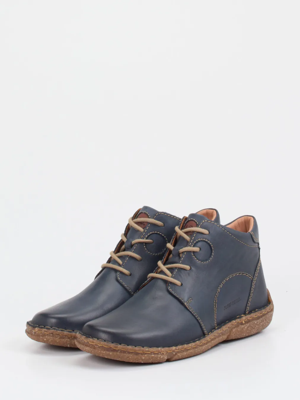 Naturnaher Look für entspannte Tage.Josef Seibel präsentiert diese komfortablen Schnürstiefeletten für Damen. Ideal für Freizeit und Alltag bietet das Modell dank der Kombination aus geschmeidigem Kalbleder mit matter Oberfläche und gepolstertem Einstieg hohen Tragekomfort. Die dunkelblaue Farbgebung mit beigen Kontrastnähten, naturfarbenen Schnürsenkeln und einem seitlichen Reißverschluss verleiht der knöchelhohen Silhouette eine lässige Authentizität. Eine flexible Sohle aus Naturkautschuk und das weich ausgekleidete Innenfutter sorgen für Komfort bei jedem Schritt. Der reduzierten Formensprache liegt ein skandinavisch inspirierter Komfortstil zugrunde. Ein durchdachter Begleiter mit nachhaltiger Note für stilvolle Ungezwungenheit.