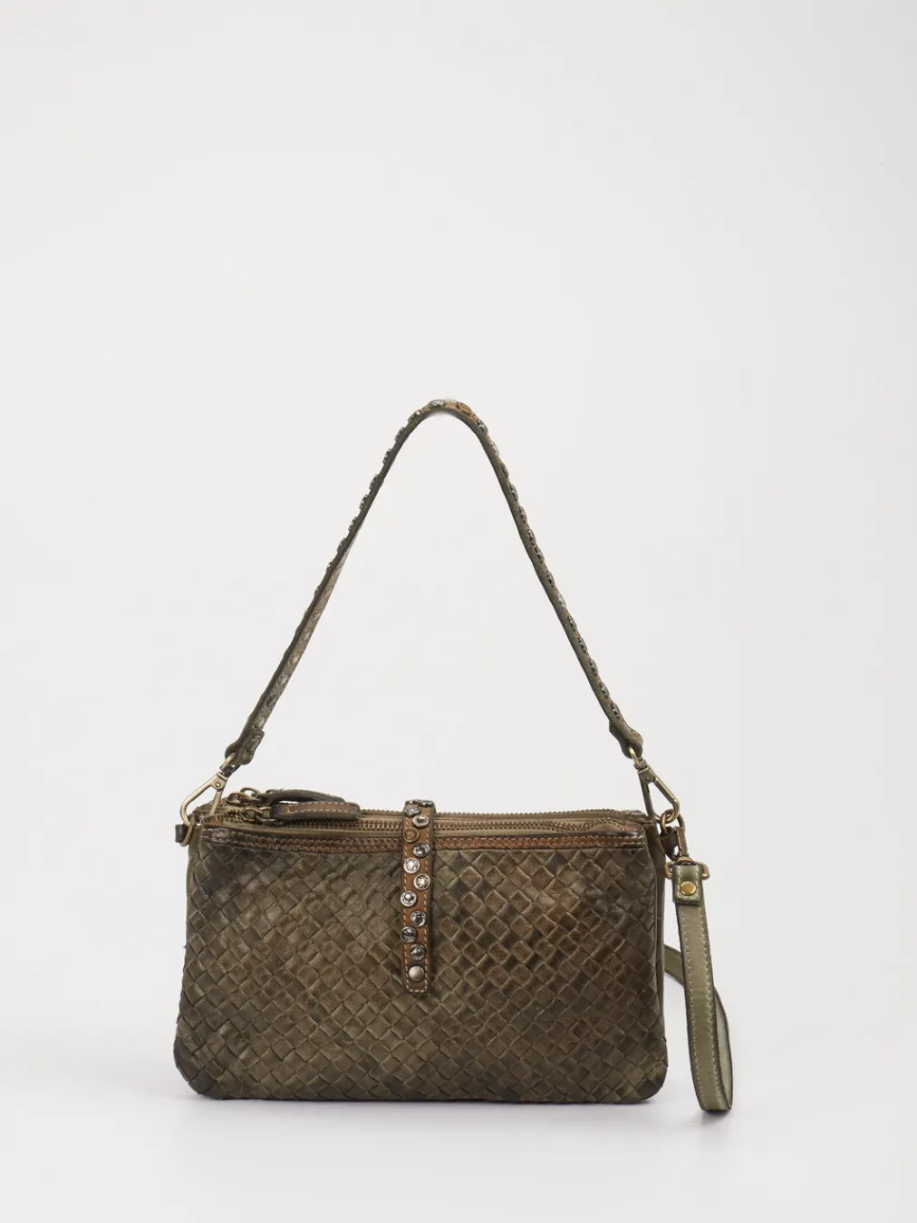 Boho-Charme mit Struktur. Die Schultertasche von Alchimia interpretiert das Crossbody-Format im kompakten Stil neu. Ideal für urbane Tage oder abendliche Anlässe: Gefertigt aus hochwertigem Kalbleder mit geflochtener Oberfläche und matter Haptik zeigt das Modell Charakter. Der olivgrüne Grundton wird durch bronzebraune Akzente und glänzende Nieten effektvoll ergänzt. Eine klare Silhouette, drei Reißverschlussfächer und ein abnehmbarer Schulterriemen vereinen Stil mit Alltagstauglichkeit. Boho- und Vintage-Einflüsse machen die Tasche besonders begehrt bei trendbewussten Looks. Ein überzeugendes Detailstatement aus dem Hause Alchimia für vielseitige Kombinationen.