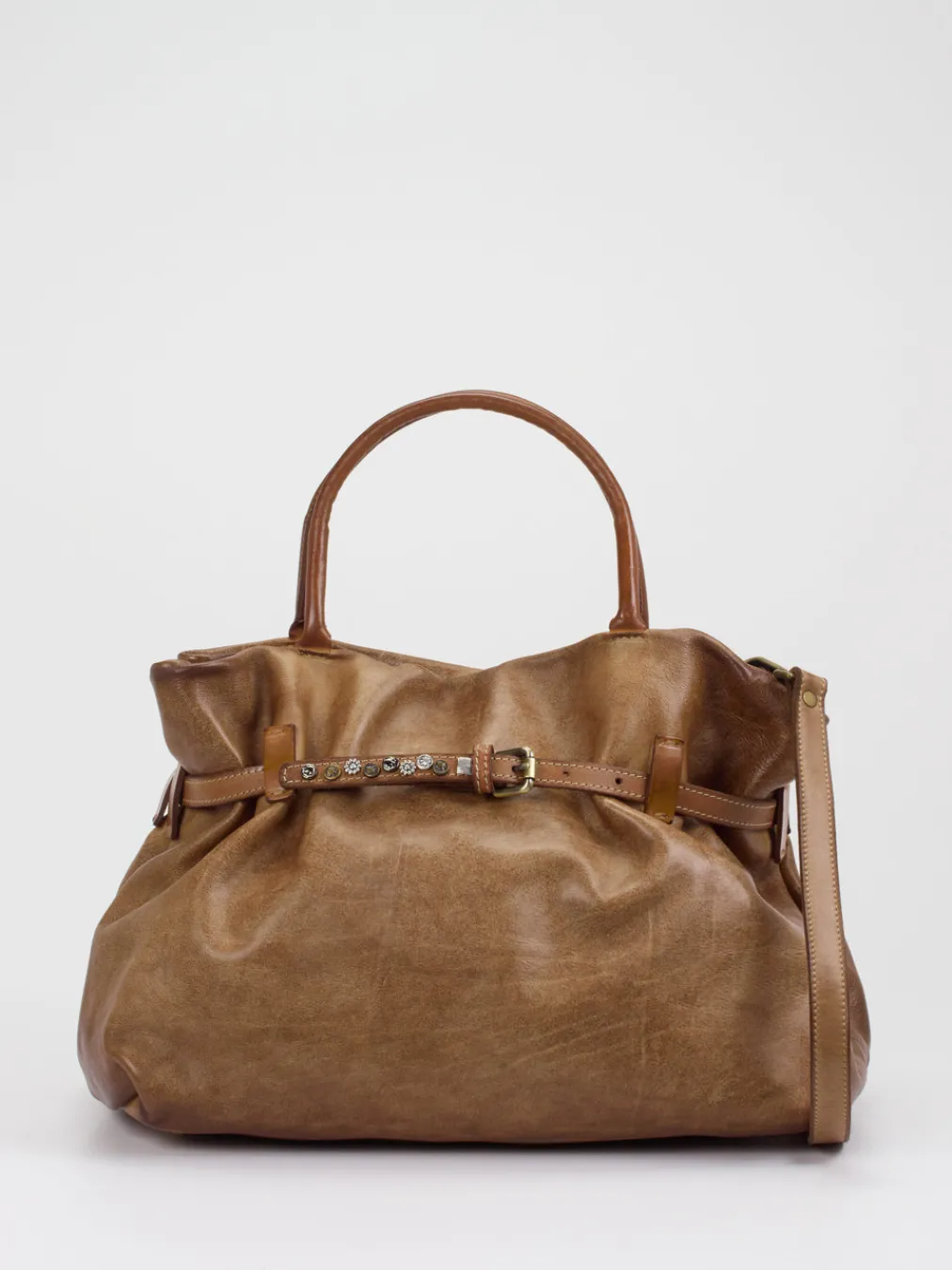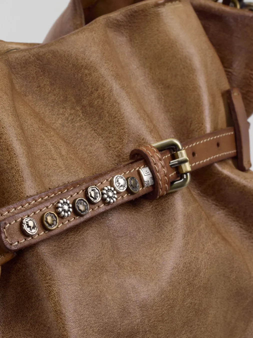 Diese geräumige Tasche aus cognacfarbenem Kalbleder besticht durch Vintage-Charme und raffinierte Details. Ziernieten und antikgoldene Hardware verleihen dem Modell ein stilvolles Update mit Boho-Flair.