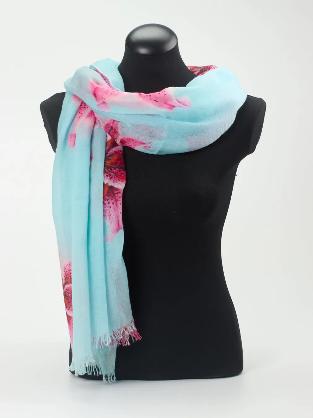 Dieses bezaubernde Tuch kommt von dem Label Cashmere Couture. Gefertigt aus 100% Kaschmir, fühlt sich das Material zart und weich an. Pinke Tigerlilien strahlen auf einem hellblauen Grund. Abgeschlossen wird der Look von attraktiven Fransen. Mit diesem Fashion-Piece setzen Sie ein luxuriöses Highlight in Ihrer Garderobe. – Material: 100% Kaschmir – Maße: ca. 210 x 120 cm – Pflegehinweise: Kalte Handwäsche mit mildem Shampoo/ Trockenreinigung – Das Label unterstützt langfristig Frauen in Nepal mit fairen Löhnen. Jedes Tuch ist ein handwerkliches Unikat.