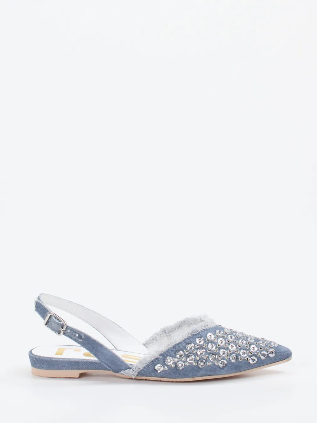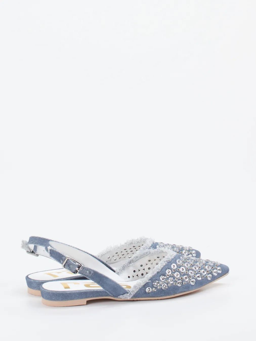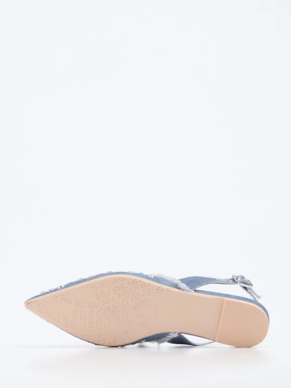 Y2K trifft Streetstyle: Die Slingback-Ballerinas von RAS kombinieren fransigen Denim mit glitzernden Strasssteinen zu einem modernen Look voller Ausdrucksstärke.