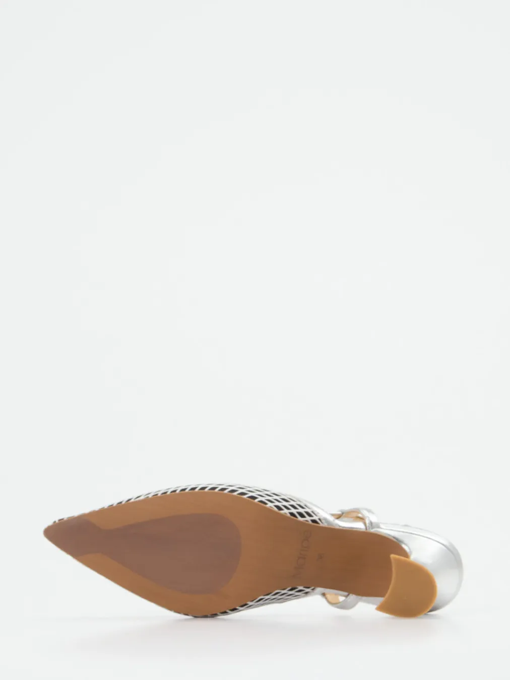 Diese Slingback-Pumps verbinden glänzendes Metallic-Finish mit einer modernen Netzstruktur – ideal für stilbewusste Auftritte mit Retro-Charme.