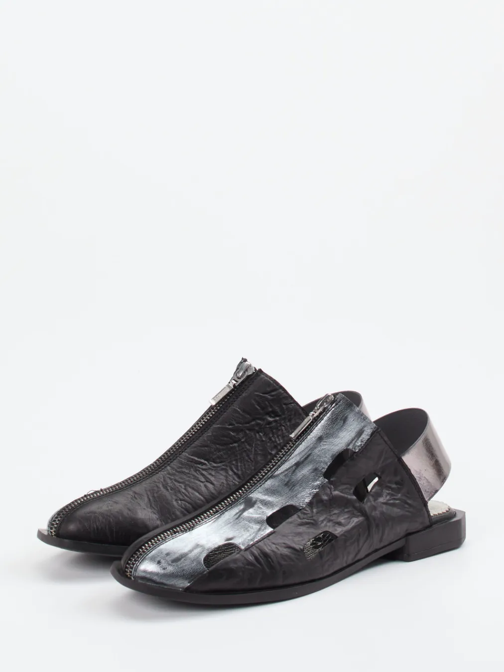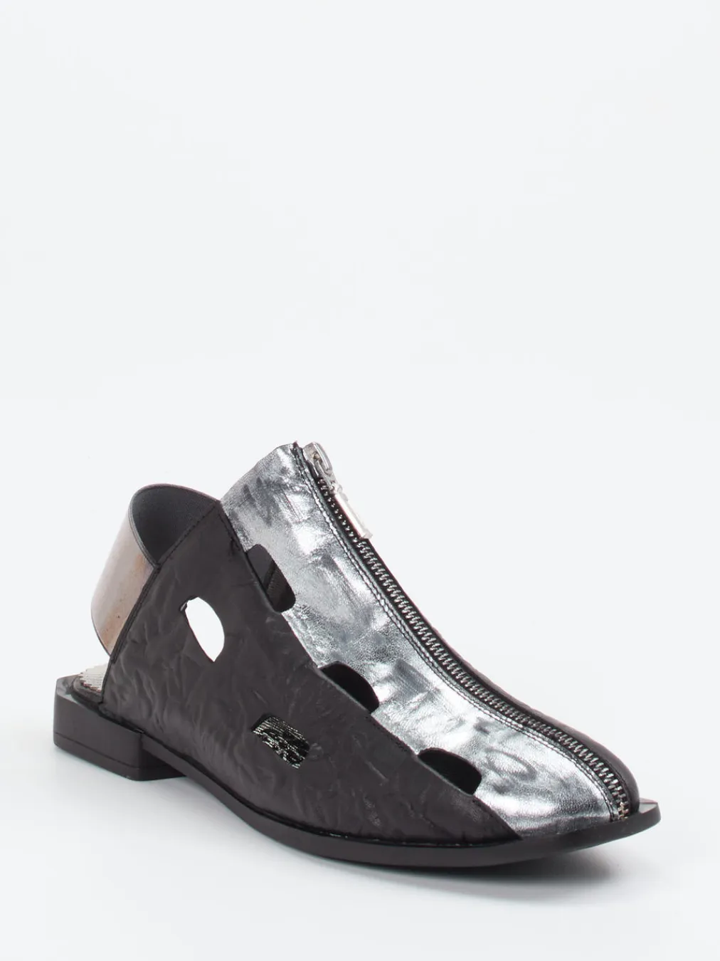 Stil-Bekenntnis in Metallic.Papucei interpretiert Damen-Slingpumps mit rebellischer Eleganz. Ob für Citywalks oder Galeriebesuche – dieser Slingpumps bietet eine Kombination aus geknittertem Velourleder und silberfarbenem Metallicleder. Das spitz zulaufende Design wird durch luftige Cut-Outs und einen asymmetrisch gesetzten Reißverschluss akzentuiert. Die offene Ferse mit breitem Metallic-Riemen sorgt für sicheren Halt, während die strukturierte Gummisohle rutschhemmenden Komfort bietet. Inspiriert von Avantgarde und Minimalismus setzt das Modell auf einen eigenwilligen Look im Metallic-Trend, ideal für trendorientierte Outfits. Papucei steht für kompromisslose Formensprache mit femininer Aussagekraft.