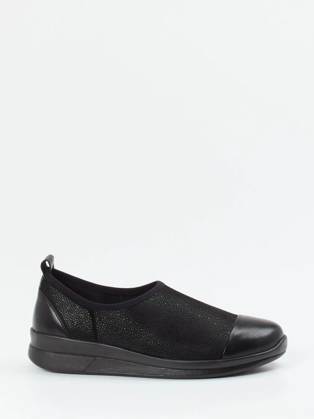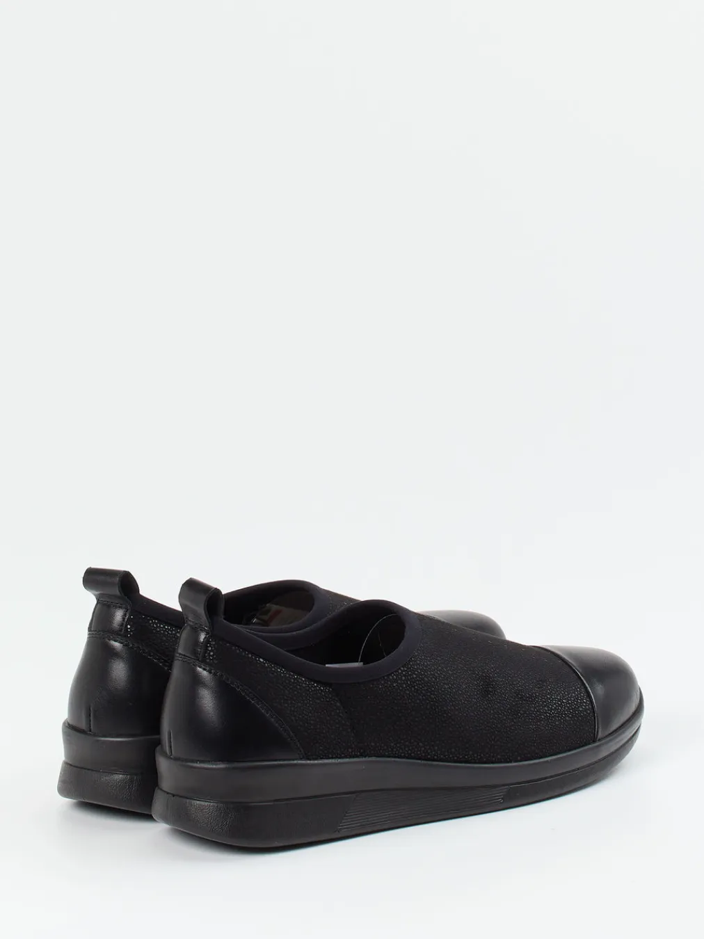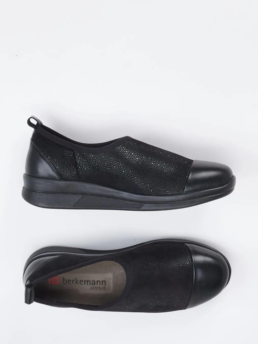 Eleganz trifft Komfort im Alltag.Die Marke Berkemann präsentiert einen schwarzen Slip-On Sneaker für Damen aus der Sari-Linie. Ideal für entspannte Alltagsmomente bietet dieser Slipper ein komfortorientiertes Design mit ergonomischer Laufsohle. Das Stretchmaterial mit dezentem Glanz im Pünktchendesign harmoniert stilvoll mit Glattleder-Partien an Zehen- und Fersenbereich. Die rund geformte Silhouette mit zugfreundlicher Schlupfform und Profilsohle sorgt für sicheren Sitz und leichtes Anziehen. Dezente Markenprägung, minimalistische Ästhetik und die Option für eigene Einlagen verbinden Komfort mit dem Trend ‚Comfort Core‘. Ein durchdachtes Modell für komfortbewusste Looks mit zurückhaltender Raffinesse.