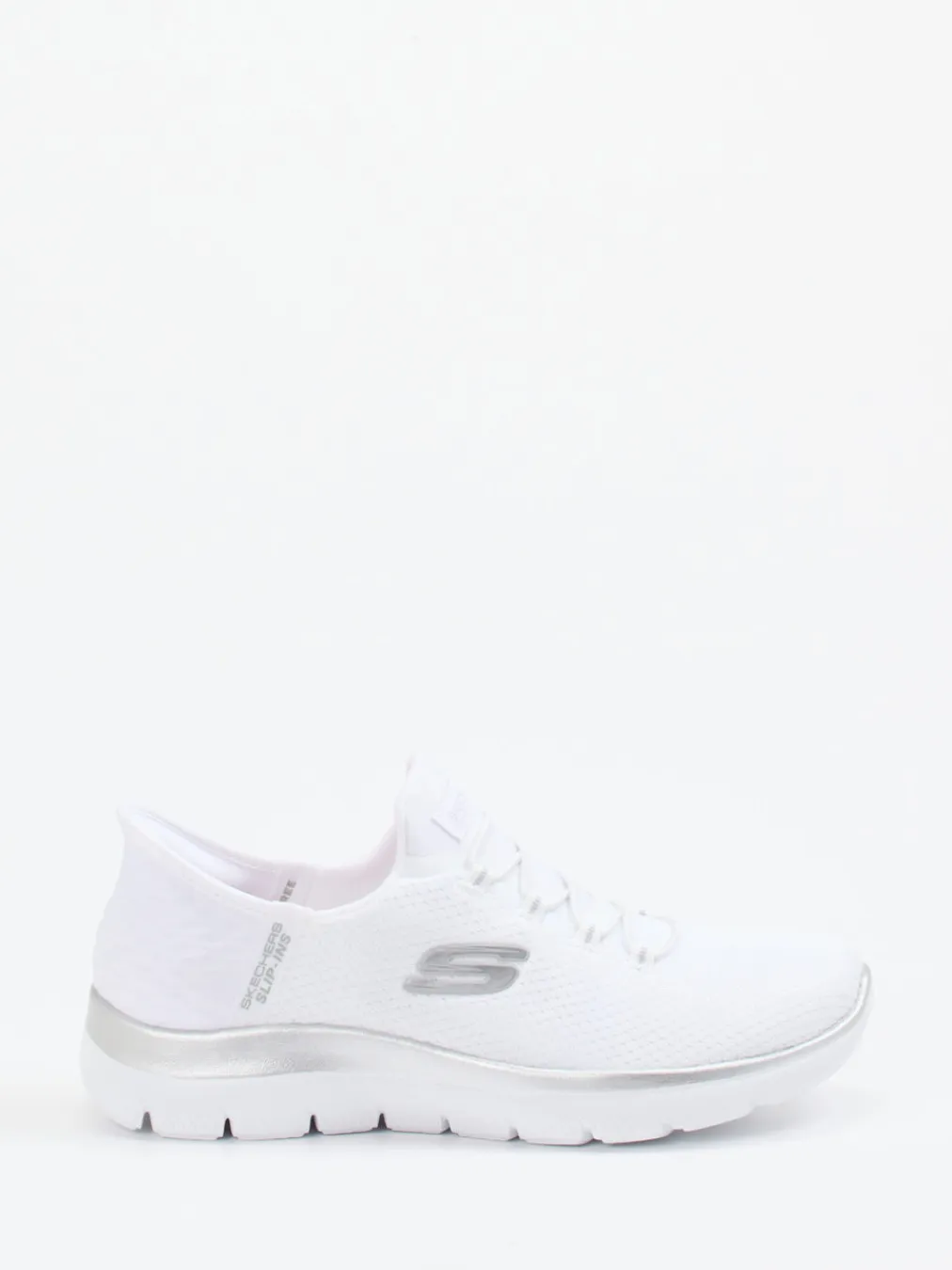 Sportiver Minimalismus mit Komfort.Skechers präsentiert mit diesem Slip-On Sneaker ein ideales Freizeitmodell für Damen. Ob auf dem Weg zum Training oder beim Stadtbummel – die Kombination aus atmungsaktivem Textilmesh und silberfarbenen Details sorgt für ein leichtes Tragegefühl und moderne Optik. Die strukturierte Oberfläche in Weiß verleiht dem Low-Top-Sneaker eine cleane Linie, während elastische Schnürung und verstärkte Slip-in-Ferse unkomplizierten Einstieg garantieren. Die Air-Cooled Memory Foam-Innensohle erhöht den Tragekomfort zusätzlich. Besonders passend zu sportlich-lässigen Outfits. Ein Sneaker, der Komforttechnologie mit stilvoller Funktionalität verbindet – typisch Skechers.