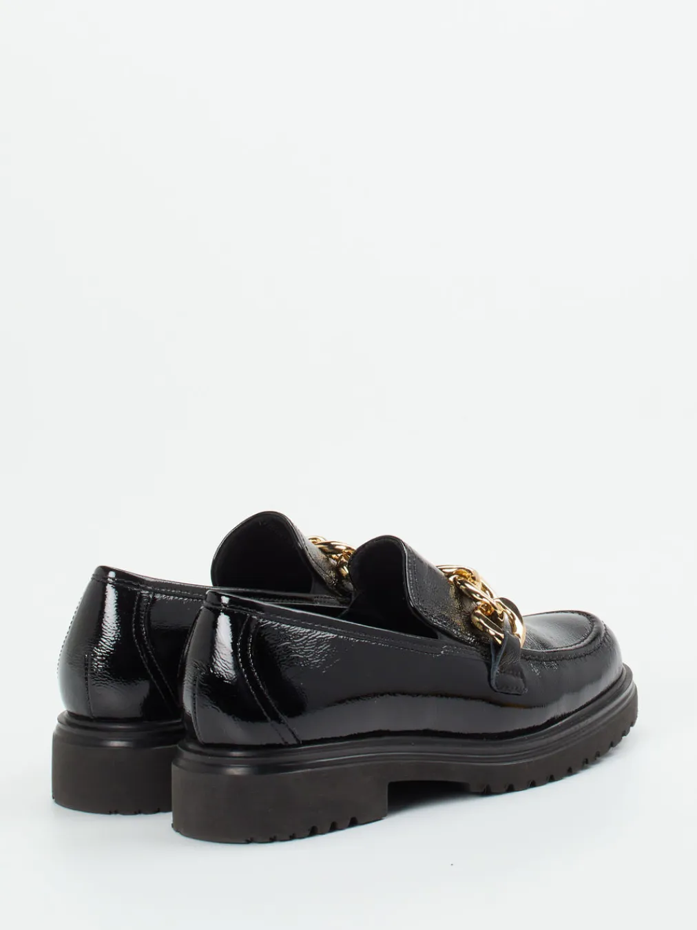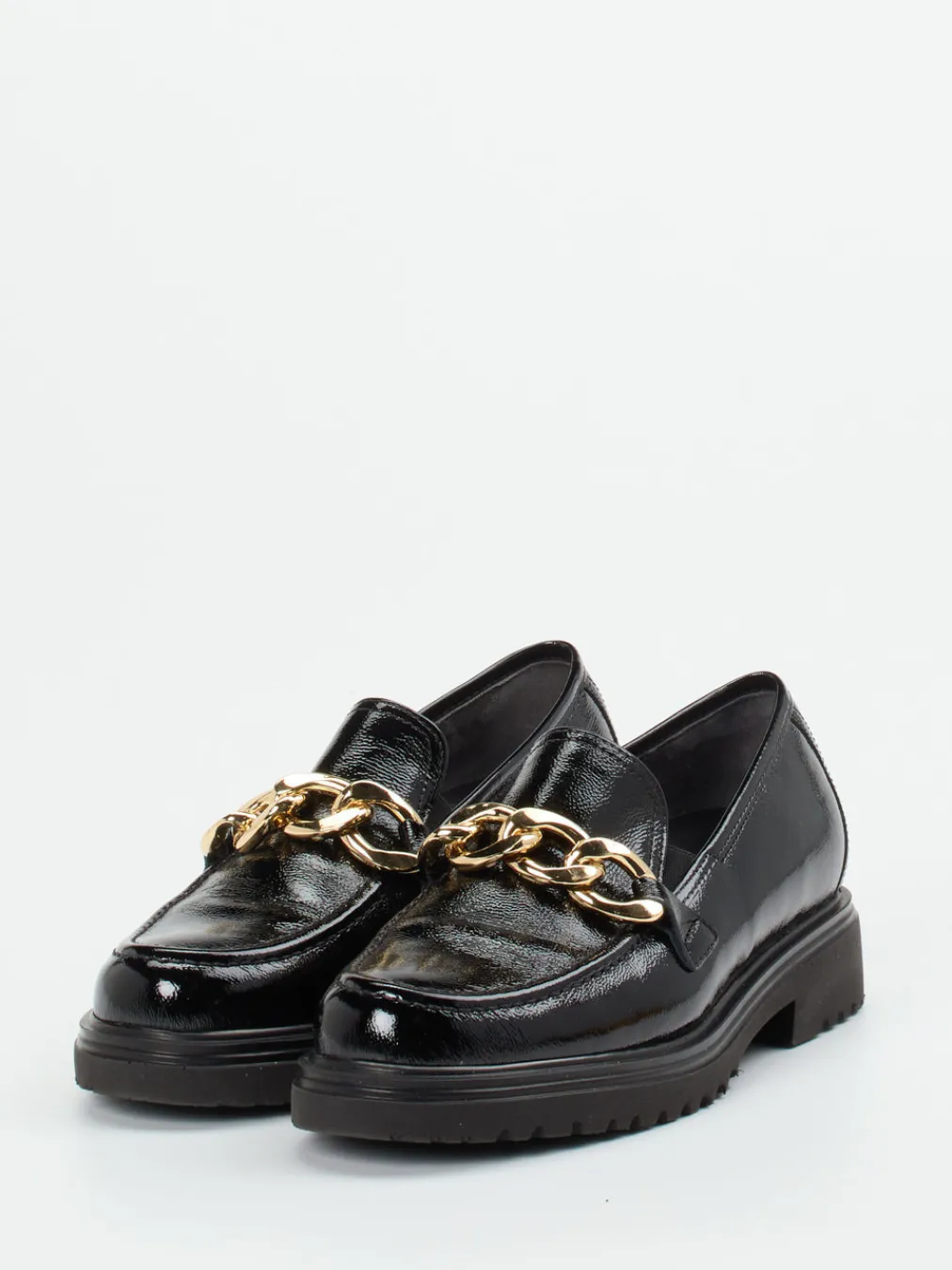 Glänzendes Lackleder trifft auf profilstarke Sohle und edles Kettendetail – ein stilbewusster Auftritt mit Komfortweite garantiert.