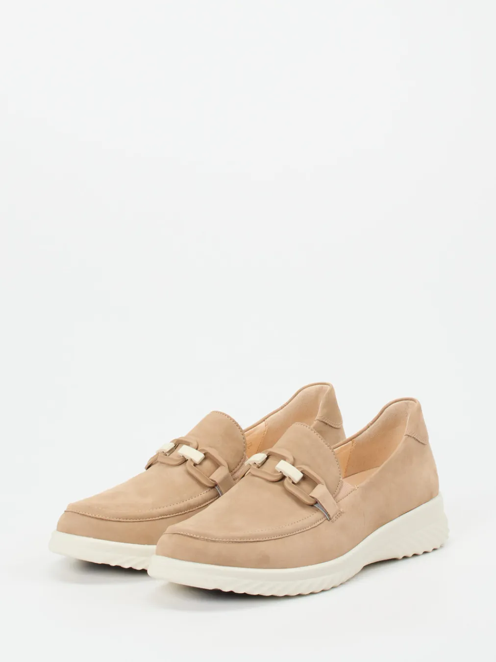 Minimalismus mit Komfortanspruch.Der Damen-Slipper von Ganter kombiniert dezente Eleganz mit alltagsfreundlichen Features. Ideal für Office und Freizeit, überzeugt dieser Loafer aus hochwertigem Nubukleder, samtig angeschliffen und in hellem Beigebraun gefärbt. Die klare Silhouette mit flacher Form und komfortabler Weite H wird durch eine helle Kunststoffkette akzentuiert. Eine profilstarke 4-Punkte-Sohle mit Dämpfung trägt zur angenehmen Laufperformance bei. Die Schlupfform mit seitlichen Elasteinsätzen sorgt für passgenauen Sitz. Inspiriert vom Streetwear-Minimalismus ist er Teil des „Quiet Luxury“-Trends. Flexibilität trifft auf detailverliebte Verarbeitung – made by Ganter.