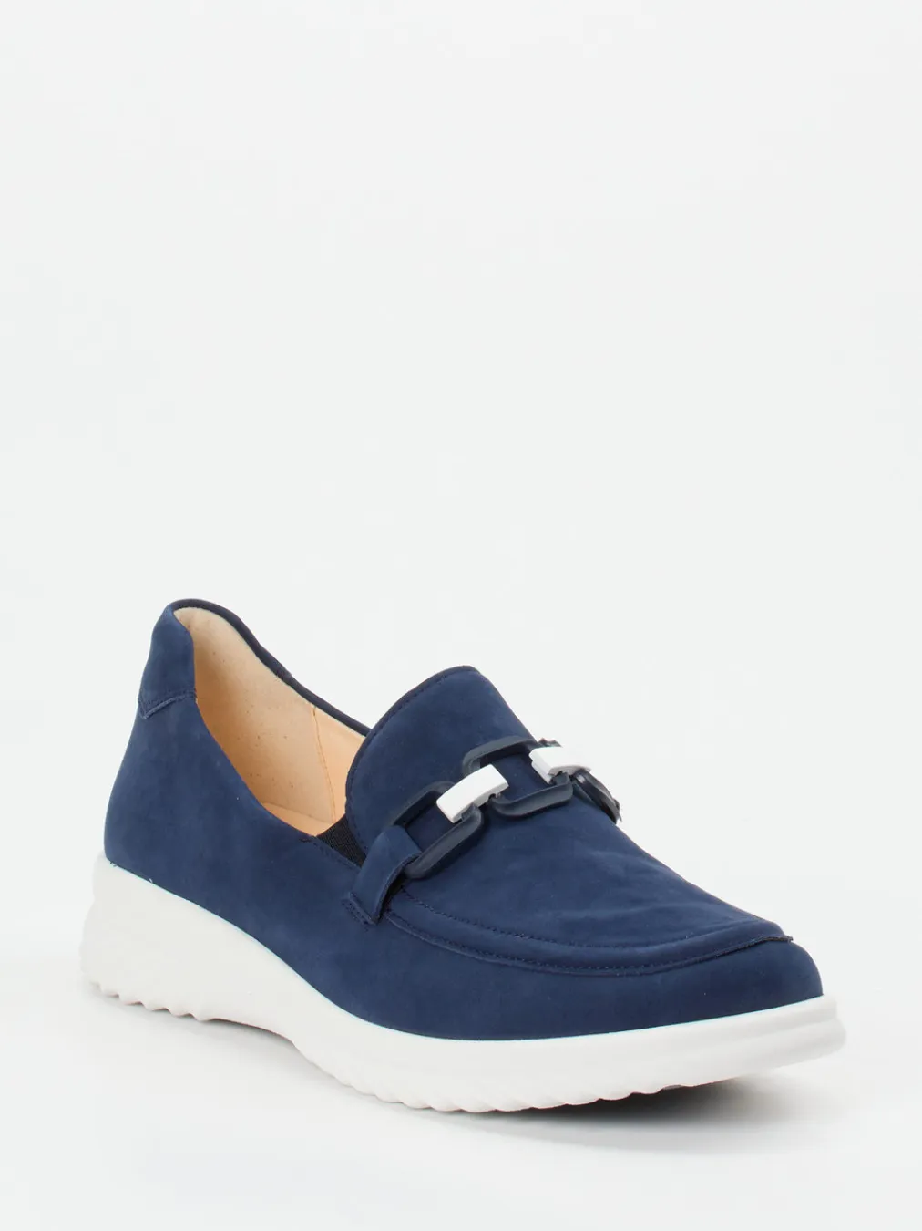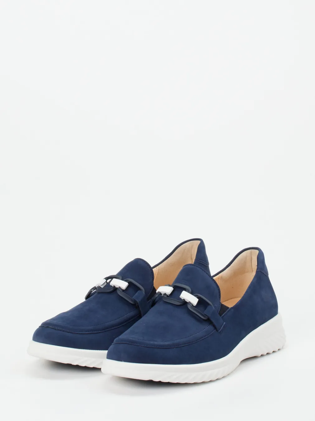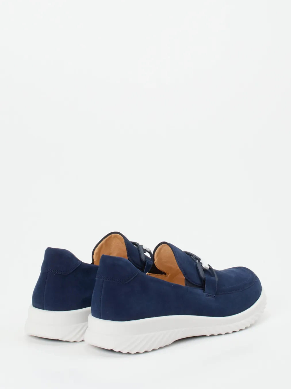 Modischer Komfort im Arbeitsalltag.Ganter präsentiert einen Damen-Komfortslipper in der Form Heike. Ideal für lange Bürotage oder entspannte Citybummel: Das weich verarbeitete Nubukleder zeigt sich samtig angeschliffen in Marineblau und erhält durch die zweifarbige Kettenapplikation auf dem Spann ein modisches Detail. Der Schuh überzeugt durch sein bequemes H-Weiten-Fußbett, das sogar auswechselbar ist, und die flexible, weiße 4-Punkte-Sohle mit Profil. Seitliche Elasteinsätze erleichtern den Einstieg und erhöhen den Tragekomfort. Die abgerundete Silhouette unterstreicht die dezente Linie. Ein stilvoller Komfortschuh für Alltag und Büro mit technischer Raffinesse.