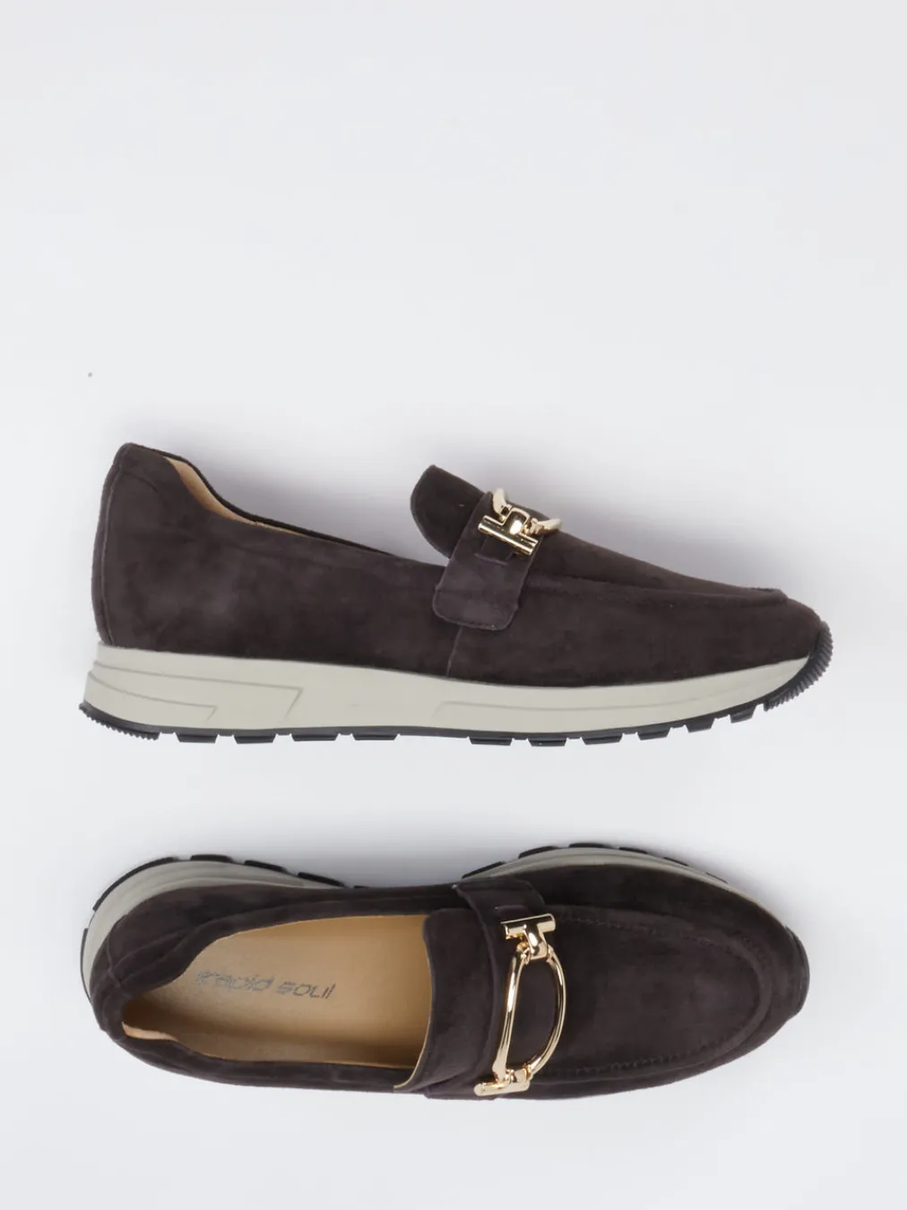 Modernität trifft Komfort im Alltag.Rapid Soul präsentiert einen Damen-Slipper im angesagten Loafer-Stil. Ideal für urbane Alltagssituationen, besticht dieses Modell durch weiches Veloursleder mit matter Oberfläche in Dunkelbraun und eine sportliche Plateausohle aus Gummi. Die goldfarbene Zierspange akzentuiert das klassische Design, während die profilierte Sohle Komfort und Trittsicherheit bietet. Die komfortable Schlupfform und das Microfaserfutter machen ihn auch für längere Tage im Büro oder beim Stadtbummel attraktiv. Als Teil des „Hybrid Loafer“-Trends fügt sich der Schuh in moderne Preppy- oder Minimalismus-Looks. Harmoniert besonders gut mit Kaschmirteilen oder strukturierten Stoffen. Ein ausdrucksstarker Loafer mit ruhiger Ästhetik und hohem Tragewert.