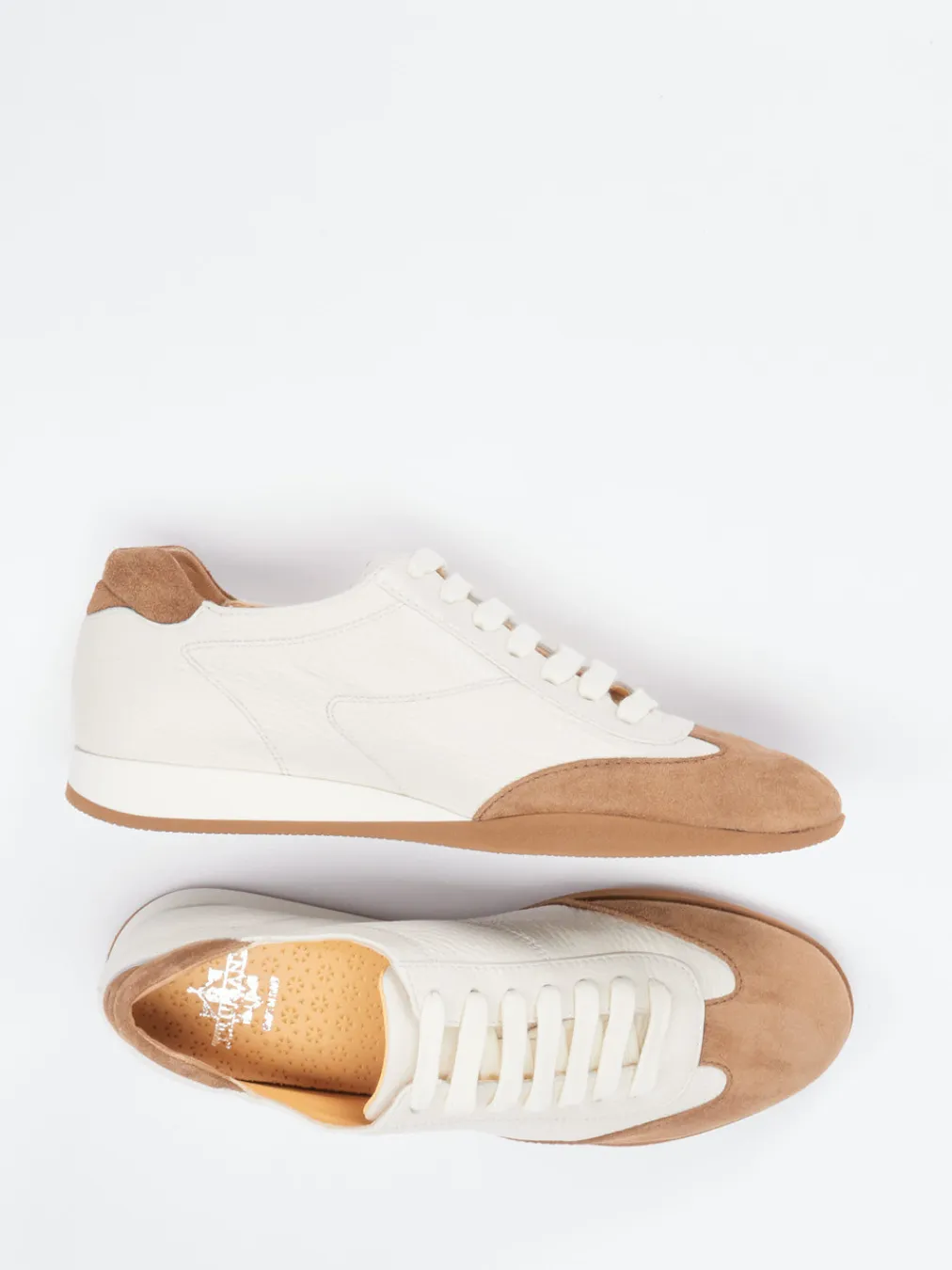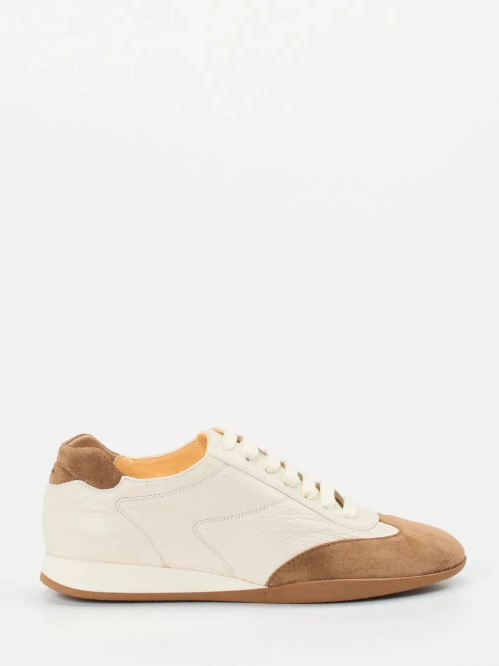 Zurückhaltender Stil, klare Linien.Truman’s präsentiert einen modernen Retro-Sneaker für den Alltag. Ob beim Stadtbummel oder auf Reisen – der Unisex-Sneaker bietet mit seiner gepolsterten Innensohle und flexiblen Gummisohle ausgezeichneten Komfort. Das glatte Hirschleder in Cremeweiß harmoniert mit karamellfarbenem Veloursleder, die genarbte Oberfläche unterstreicht das hochwertige Gesamtbild. Eine flache Silhouette, Schnürung und eine zweifarbige Sohle runden das Design ab. Dezente Details wie das Branding auf der Zunge setzen subtile Akzente. Inspiriert von 90er-Vibes und „Quiet Luxury“ passt er perfekt zu Naturtönen und minimalistischen Looks. Zeitloses Design und komfortable Verarbeitung – typisch Truman’s.