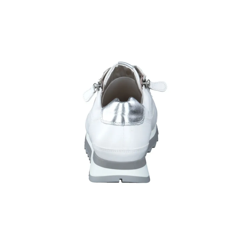 Ideal für entspannte City-Streifzüge oder stilbewusste Alltagsmomente: Gefertigt aus weißem Kalbleder mit samtig-glatter Oberfläche, setzt die silberfarbene Metallic-Ferse einen dezenten Akzent. Die klassische Silhouette wird durch perforierte Details, seitliche Reißverschlüsse und die individuell justierbare Schnürung aufgelockert. Die profilierte Gummisohle unterstützt den natürlichen Bewegungsablauf und ergänzt den funktionalen Komfort. Inspiriert von „Quiet Luxury“ darf dieser Sneaker in minimalistischen Streetwear-Looks nicht fehlen.
