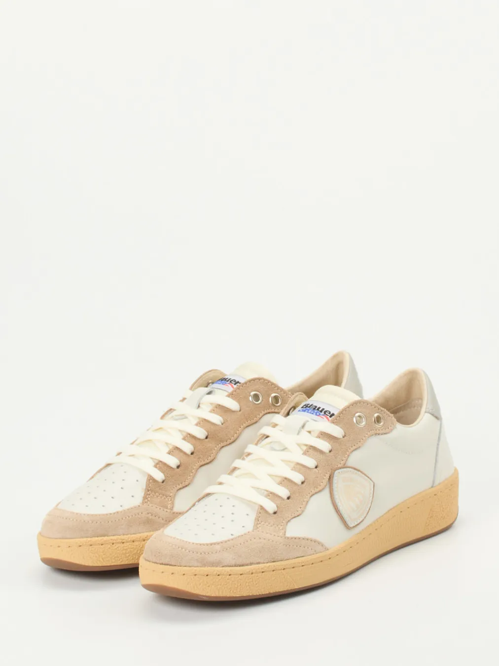 Retro-Chic mit klarer Formsprache.Die amerikanische Marke Blauer bringt mit diesem Sneaker einen Streetstyle-Klassiker zurück auf die Bildfläche. Fein genarbtes Kalbleder in Cremeweiß trifft auf taupefarbenes Veloursleder mit weicher Textur. Die klassische flache Silhouette wird durch eine perforierte Zehenbox, Ton-in-Ton-Metallösen und ein seitliches Logo-Patch akzentuiert. Die funktionale Gummisohle bietet verlässlichen Grip. Inspiriert vom Vintage-Court-Stil der 90er, passt das Modell ideal zu entspannten Looks zwischen Freizeit und Sommerurlaub. Besonders harmonisch wirkt es zu beiger Chino und Oversize-Shirts. Blauer verbindet gestalterischen Purismus mit anspruchsvoller Materialverarbeitung.