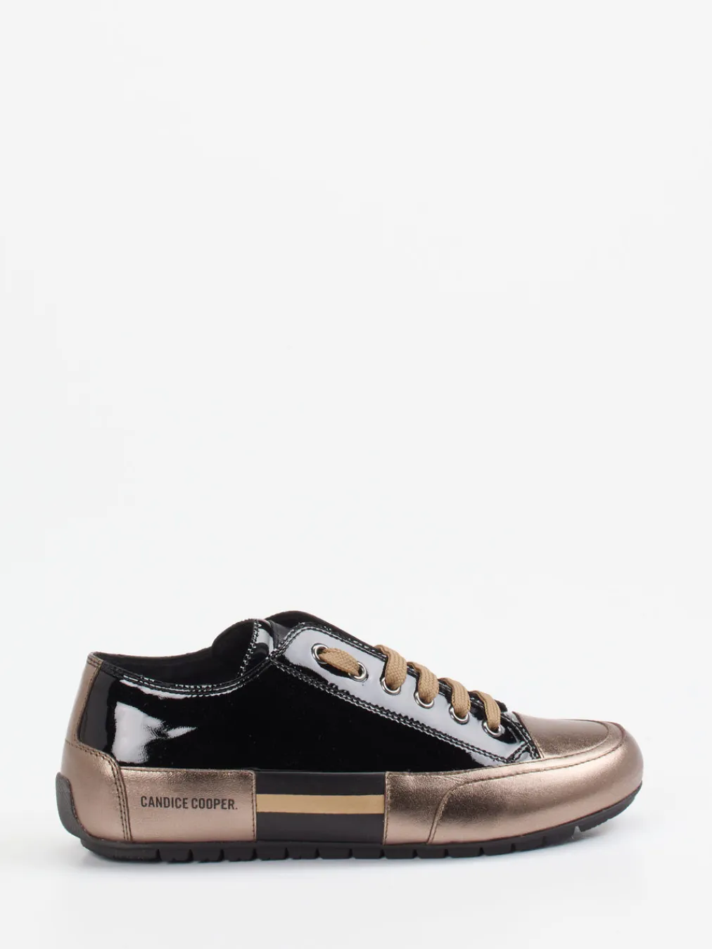 Glanz trifft Streetstyle.Candice Cooper präsentiert diesen modischen Damen-Sneaker. Ob in der City oder auf der nächsten After-Work-Party – die Kombination aus hochwertigem Lackleder und metallicfarbenen Highlights macht das Modell zum stilvollen Hingucker. Schwarzes Lackleder sorgt für makellosen Glanz, während Details in Bronzebraun und Goldton auffällige Akzente setzen. Die flache Silhouette, klassische Schnürung und profilierte Gummisohle unterstreichen den sportlich-urbanen Charakter. Goldfarbene Seitenstreifen und markentypisches Logo runden das Design ab. Harmoniert besonders gut mit monochromen Looks oder Statement-Bags. Premium-Komfort und ausgefallener Look – typisch Candice Cooper.