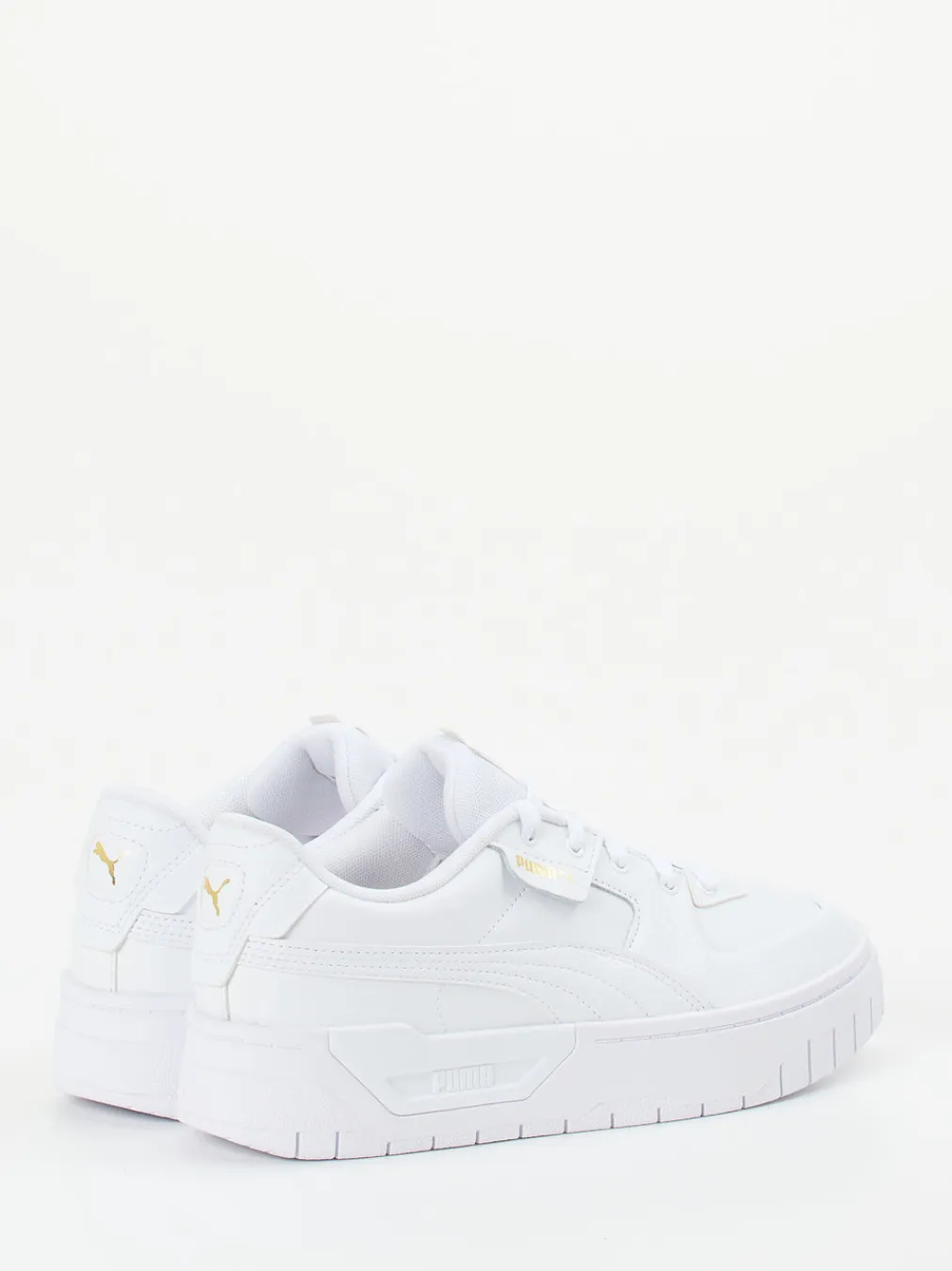 Weißes, natürlich genarbtes Leder sorgt für einen cleanen Look, während goldfarbene Logos edle Akzente setzen. Die markante Plateausohle unterstreicht das chunky Profil und bietet Alltagstauglichkeit mit Stil. Dank gepolstertem Schaftrand und weicher Innensohle punktet das Modell auch funktional. Ton-in-Ton-Nähte, Mesh-Anteile und der klassische Formstrip ergänzen das Design. Lässt sich ideal mit Jogpants oder minimalistischen Casual-Outfits kombinieren.