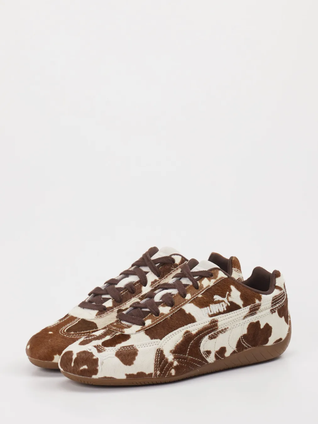 Seine auffällige Kuhfell-Optik mit braun-weißer Farbgebung greift den Trend der Animal Prints auf und wird durch eine haarige Oberfläche sowie eine flache, schlank zulaufende Silhouette ergänzt. Das Obermaterial besteht aus Leder, das in Kombination mit der strukturierten Gummisohle und der Schnürung einen authentisch sportlich-retro-inspirierten Look erzeugt. Tonale Nähte und ein geprägtes Seitenlogo runden das Design stilvoll ab. Der Schuh lässt sich ideal mit Jogpants oder Oversized-Hoodies kombinieren.