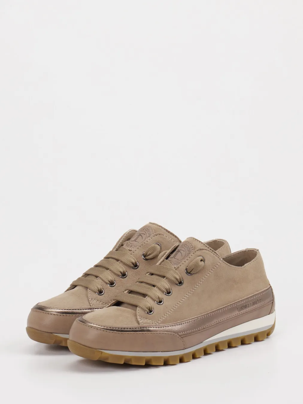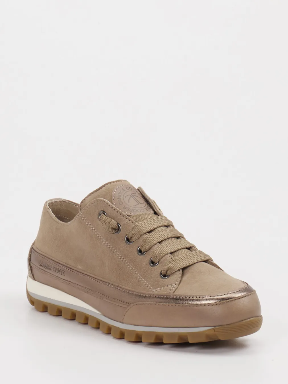 Stilvoll durch Stadt und Alltag. Candice Cooper präsentiert mit diesem Low-Top-Sneaker eine moderne und hochwertige Schuhwahl für Damen. Der Materialmix aus Velours- und glattem Leder in warmem Beigebraun wirkt edel und minimalistisch zugleich. Dezente Metallic-Details in Bronzeoptik setzen raffinierte Akzente, während die klassische Silhouette und die Schnürung für eine bequeme Passform sorgen. Die profilierte Gummisohle bietet Griffigkeit auf unterschiedlichstem Untergrund – ideal für Reisen und alltägliche Wege. Inspiriert vom Trend „Quiet Luxury“, fügt sich das Modell mühelos in vielfältige Styles. Kombiniert mit leichten Jacken oder einer eleganten Crossbody Bag entsteht ein urbaner Look mit Understatement. Hochwertige Verarbeitung trifft auf zurückhaltenden Luxus im typischen Candice Cooper Stil.