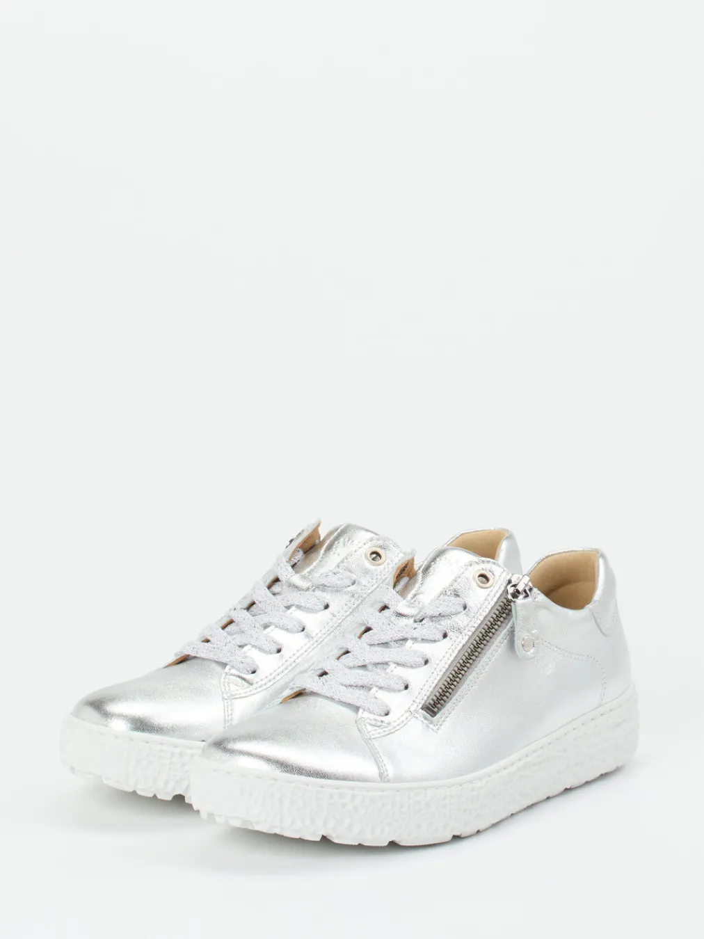 Glanzstück für jeden Tag.Der Damen-Sneaker von Hartjes gehört zur Kategorie der Bequemschuhe und überzeugt mit komfortbetonten Details. Perfekt für Stadtbummel oder Urlaubsflair: Sein Material aus hochwertigem Metallicleder in glänzendem Silber erzeugt eine moderne, minimalistische Wirkung. Die klassische, abgerundete Form mit Schnürung und seitlichem Reißverschluss vereint Funktionalität mit Design, während die extraleichte, weiße Gummisohle mit Profil für angenehme Dämpfung sorgt. Der Schuh passt sich dank Weite H und herausnehmbarer Innensohle besonders gut an. Influenced by Streetwear, im Metallic Accents Trend. Hartjes verbindet bequeme Passform mit modischem Selbstbewusstsein.