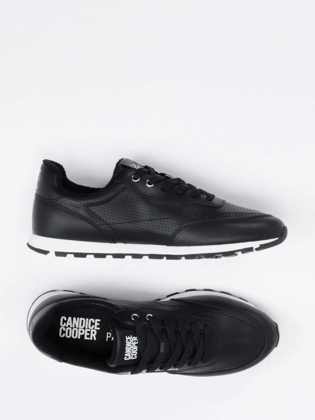 Urbaner Minimalismus mit Retro-Charakter.Candice Cooper präsentiert einen sportlich-zeitlosen Sneaker für Alltag und Freizeit. Die flache Silhouette aus schwarzem Synthetikmaterial zeigt eine matte Oberfläche mit feiner Perforation und weißen Logoprints. Eine anatomisch geformte Einlegesohle mit Aktivkohleschaum und ein Frotteefutter sorgen für angenehme Frische – auch an warmen Tagen. Die rutschfeste Profilgummisohle und die klassische Schnürung runden den monochromen Streetwear-Look funktional ab. Ideal kombinierbar mit Jogpants oder Denim für legere Styles. Markentypisch verbindet dieses Modell Komfort, Technik und urbane Ästhetik.