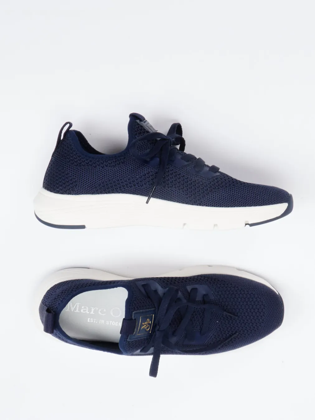 Sportlich, modern und leicht.Marc O’Polo präsentiert einen Sneaker für Damen im zeitgemäßen Athleisure-Stil. Ob unterwegs in der Stadt oder beim Spaziergang im Park – dieser sportlich-kompakte Low-Top bietet zuverlässige Leichtigkeit und Komfort. Das dunkelblaue Obermaterial aus recyceltem Textil zeigt eine luftige, gestrickte Struktur und wird durch eine tonale Schnürung ergänzt. Zuglasche, EVA-Sohle mit Dämpfung sowie das austauschbare Schaumstoff-Fußbett garantieren Funktionalität im Alltag. Die cremefarbene Laufsohle und das Logo auf der Zunge unterstreichen die minimalistische Streetwear-Ästhetik. Lässt sich ideal mit Jogpants oder leichten Sommerjeans kombinieren. Komfortabler Mesh-Sneaker im modernen Design mit nachhaltiger Note.