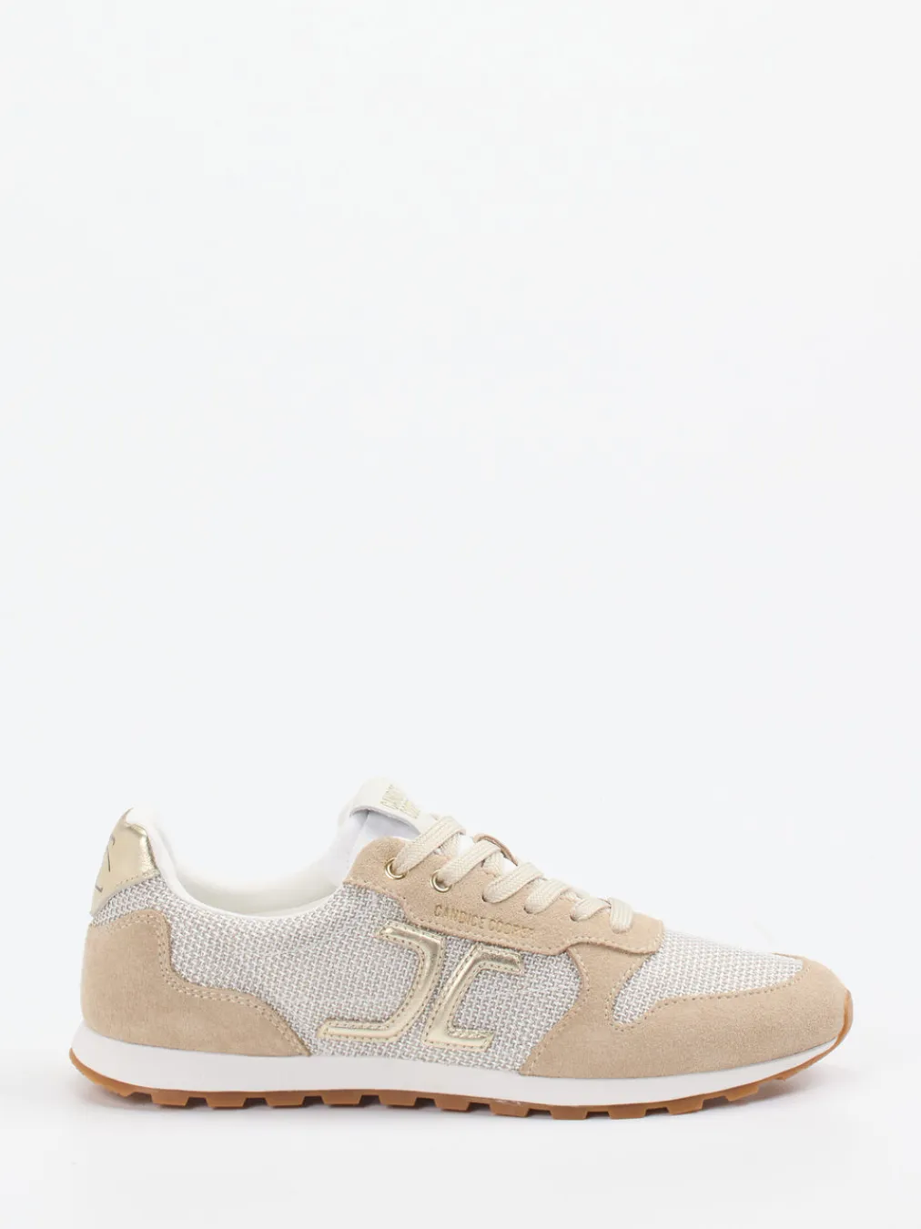 Sommerlicher Style mit Retro-Charakter.Der Damen-Sneaker von Candice Cooper verbindet modische Zurückhaltung mit funktionalem Design. Ideal für leichte Sommer-Outfits in der Freizeit überzeugt das Modell mit einer hochwertigen Materialkombination aus beigem Veloursleder und meshartigem Nylon. Goldfarbene Lederpatches und ein glänzender Fersenbesatz setzen dezente Akzente, während die flache Silhouette und die profilierte, honigfarbene Gummisohle Komfort bei jedem Schritt bieten. Die Schnürung sorgt dabei für sicheren Halt. Die cleanen Linien und metallic Nuancen spiegeln aktuelle Trendthemen wie Quiet Luxury wider und lassen sich ausgezeichnet mit natürlichen Tönen wie Leinenweiß oder Sand stylen. Ein sommerlicher Sneaker mit italienischer Note und liebevollen Details.