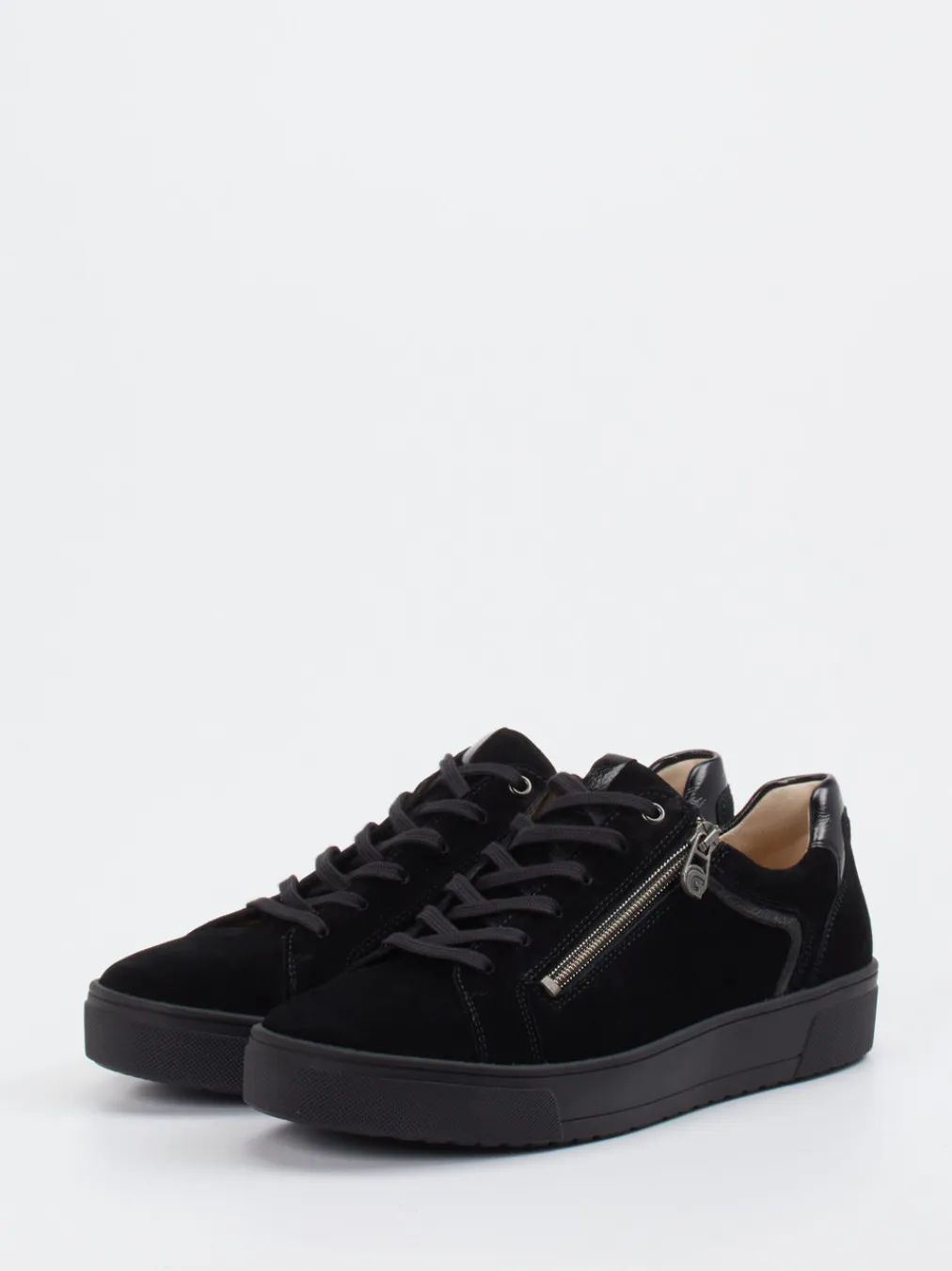 Puristisches Design mit Raffinesse.Ganter präsentiert mit diesem Damen-Sneaker einen stilvollen Begleiter für Alltag und Büro. Samtig strukturiertes Veloursleder in klassischem Schwarz wird durch glänzende Lackleder-Elemente an Ferse und Einstieg ausdrucksstark ergänzt. Die flache Silhouette vermittelt zurückhaltende Modernität, ein seitlicher Reißverschluss erleichtert den Einstieg bei gleichzeitig variablem Schnürungskomfort. Die robuste Gummisohle sorgt für Trittsicherheit, das hochwertige Lederfutter erhöht den Tragekomfort. Inspiriert vom „Quiet Luxury“-Trend überzeugt der Look mit dezenter Eleganz. Besonders harmonisch wirkt die Kombination mit dunkler Slim-Fit-Jeans. Ein durchdachter Allround-Sneaker mit Ganter-Komfort für stilbewusste Minimalistinnen.