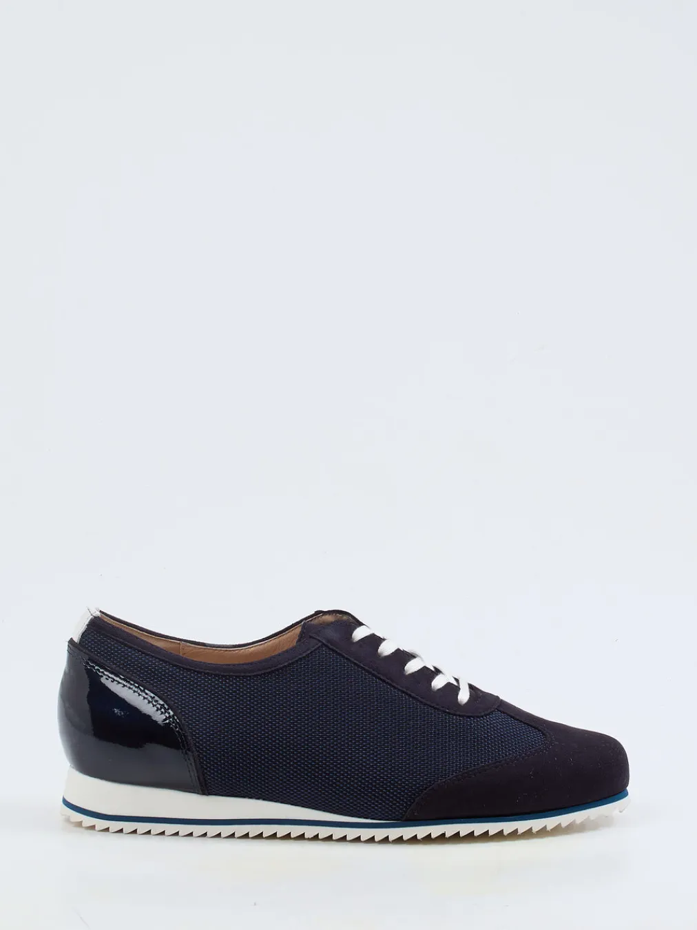 Sportlicher Chic mit Komfortpotenzial.Hassia zeigt mit diesem Damen-Sneaker eine gelungene Verbindung von modischem Minimalismus und funktionellem Design. Ideal für entspannte Tage im urbanen Umfeld bietet der Schuh dank Veloursleder und softem Meshtextil, kombiniert mit einer glänzenden Lackleder-Fersenkappe, angenehme Haptik und visuelle Spannung. Die dunkelblaue Grundfarbe erhält durch weiße Schnürsenkel und Kontraststreifen an der Gummisohle einen frischen Akzent. Die klassische Low-Top-Form und die flexible Haifischprofilsohle sorgen für Trittsicherheit und Lässigkeit. Inspiriert vom Retro-Sportswear-Trend passt er ideal zu Casual-Styles. Hassia überzeugt mit durchdachtem Design und hohem Laufkomfort in Weite G.